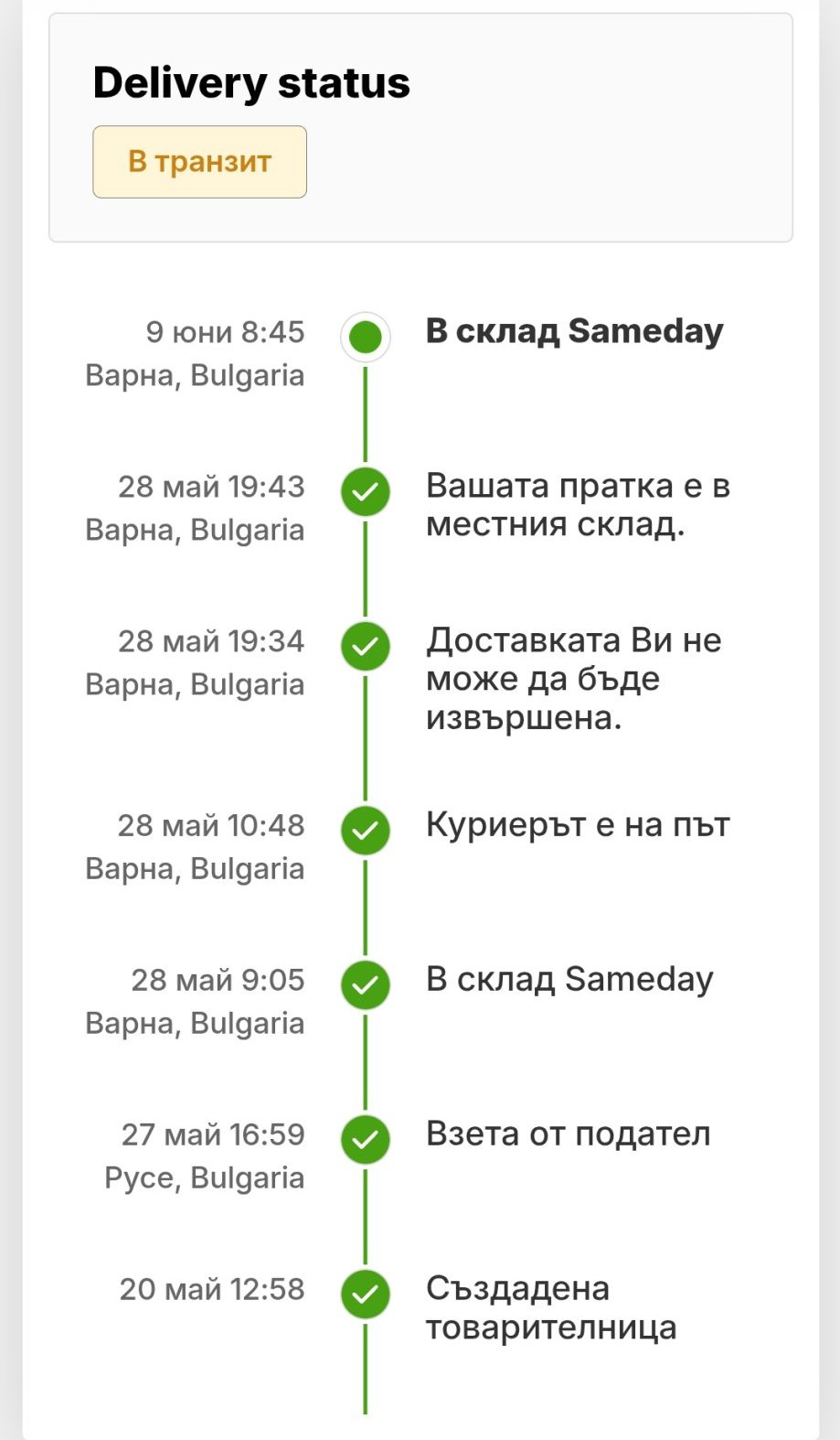 Междувременно пратката ми се размърдала. От склад Варна до склад Варна 😀