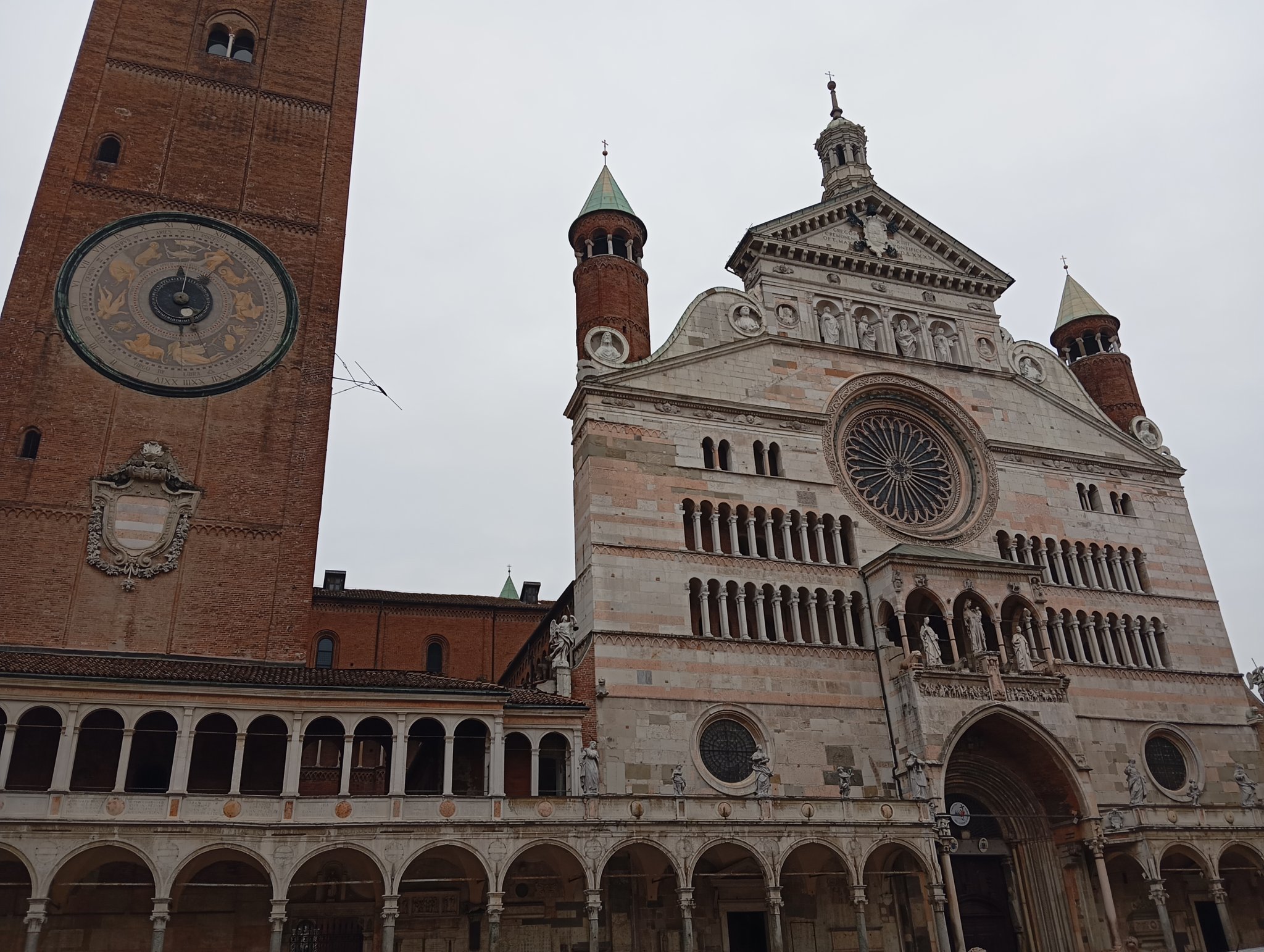 Площадчето те връща във времето на Страдивари.Сякаш е спряло. Казват,че Страдивари всяка нощ е донасял по едно дърво което оставял да пренощува в кулата с камбанарията.Затова цигулките му са вълшебни.От изток са сградите,свързани с духовния живот на хората-кулата на камбанарията,на която можеш да се изкачиш и да видиш Кремона като на длан.Катедралата е до нея,а след това други сгради на епископията.Катедралата,музеят и кулата имат работно време за посетители.Една от нашите я заключиха,но веднага след това отключиха.Един леко груб чичко,се развика нещо на италиански.Катедралата е прекрасна.