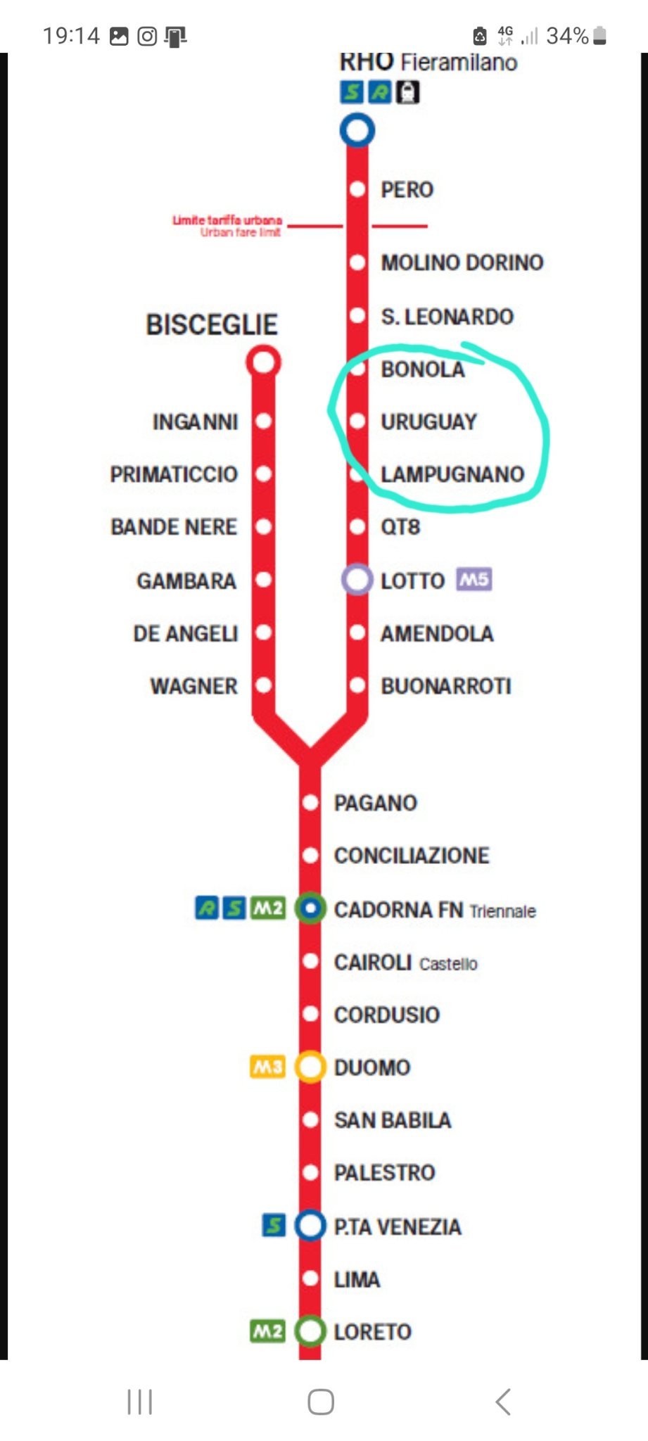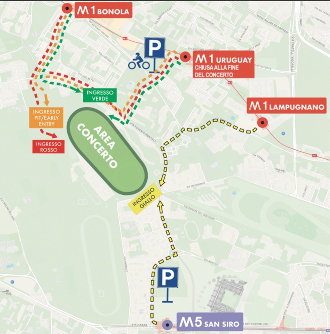 В зависимост от билетите - дали са до сцената или отзад най-общо спирките са 3 - Лампуняно, Уругвай и Бонола на червена линия М1 посока Ро Фиера.