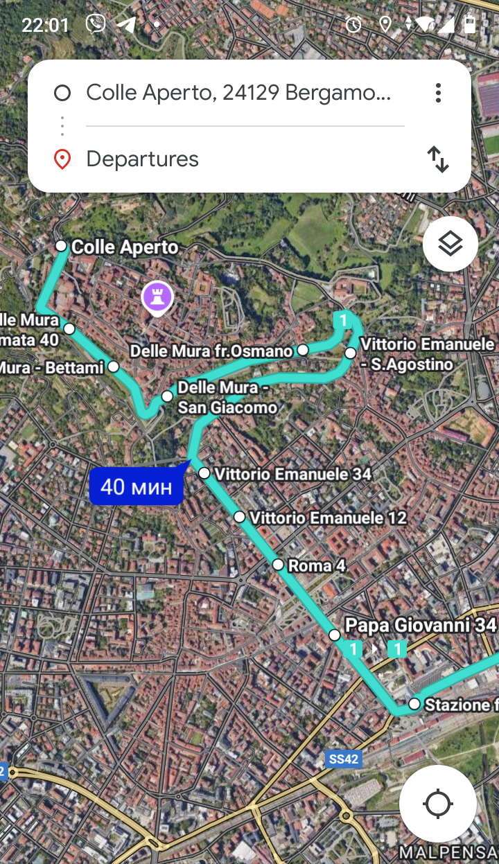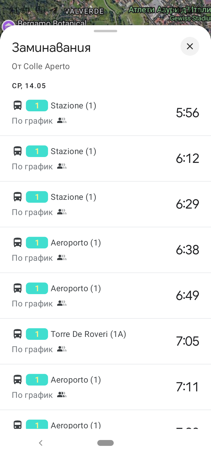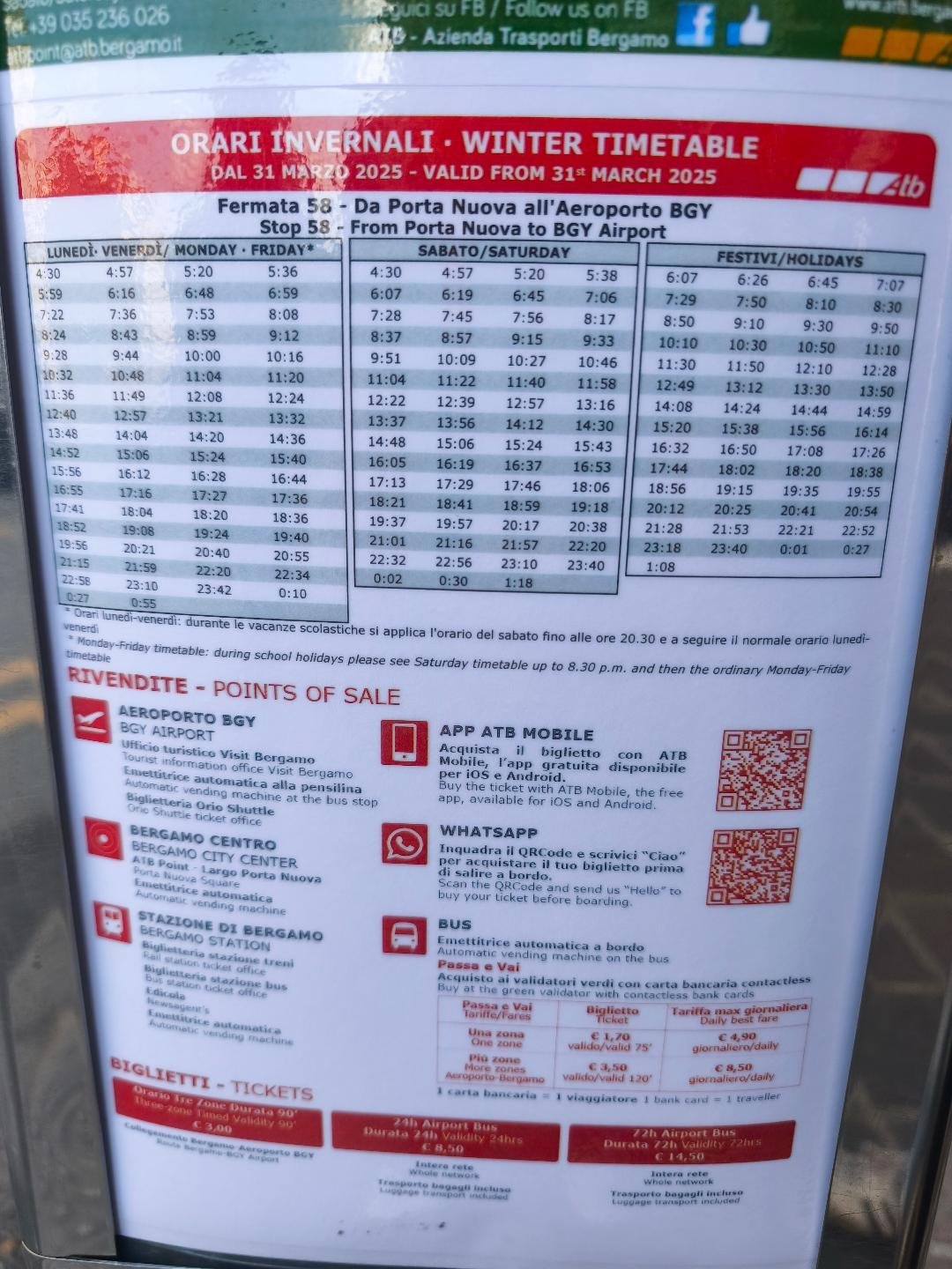 Тъпото е, че в сайта на автобусните линии на Бергамо още стои зимного разписание, но и лятното почва от 4.30 часа някъде. Сега виждам, че предната спирка, която ви върши работа е на фуникуляра, там спира в 5.30 часа по сегашното разписание. Става объркване защото в разписанието пише спирка "Funicolare", a в картата и в гугъл спирката се казва "Vittorio Emanuele fr.47". За всеки случай, може на отиване към мястото за настаняване да погледнете как е името със сигурност.