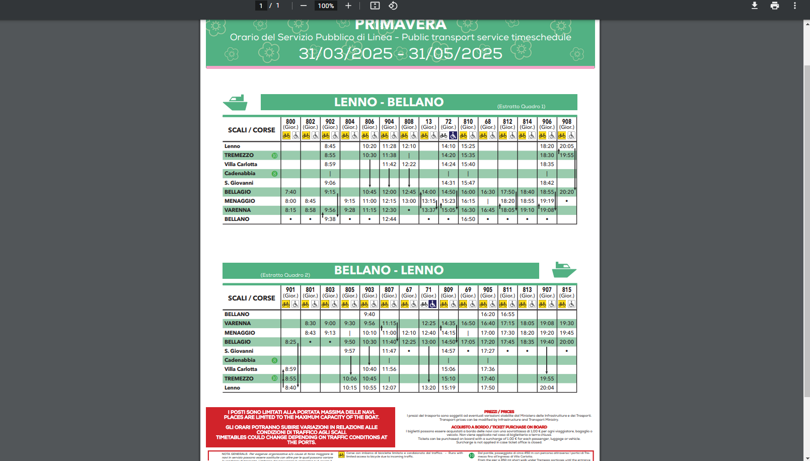 Ето така то изглежда за линията Лено - Белано, включващо спирки във Варена, Менаджо, Беладжо, Лено и т.н.
