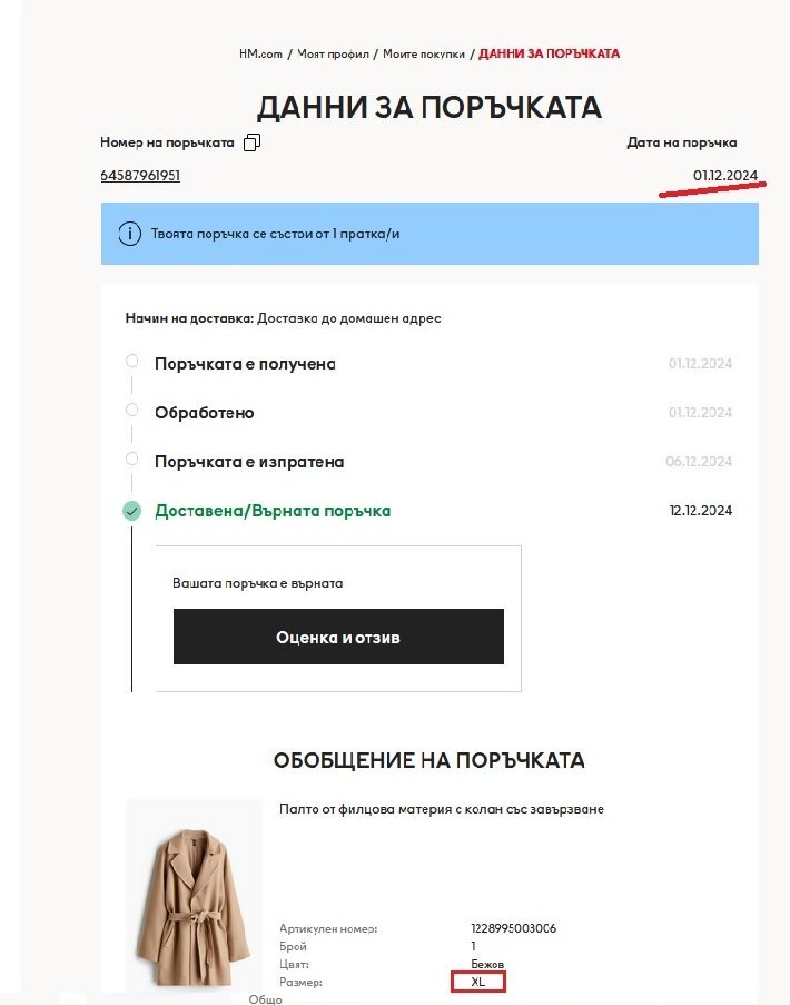 Аз пък си купих едно палто от H&M преди нова година. Но здраво се надцених с размера (XL) и направо плувам в него. Пък и ръкавите ми много дълги... Явно е за по-висока жена. Махнала съм му етикета и нямам вече и документ за връщане, защото го употребих да върна друго нещо от същата поръчка и не очаквах, че с палтото никак няма да се харесам като размер. Та моделът е това. А това самата поръчка