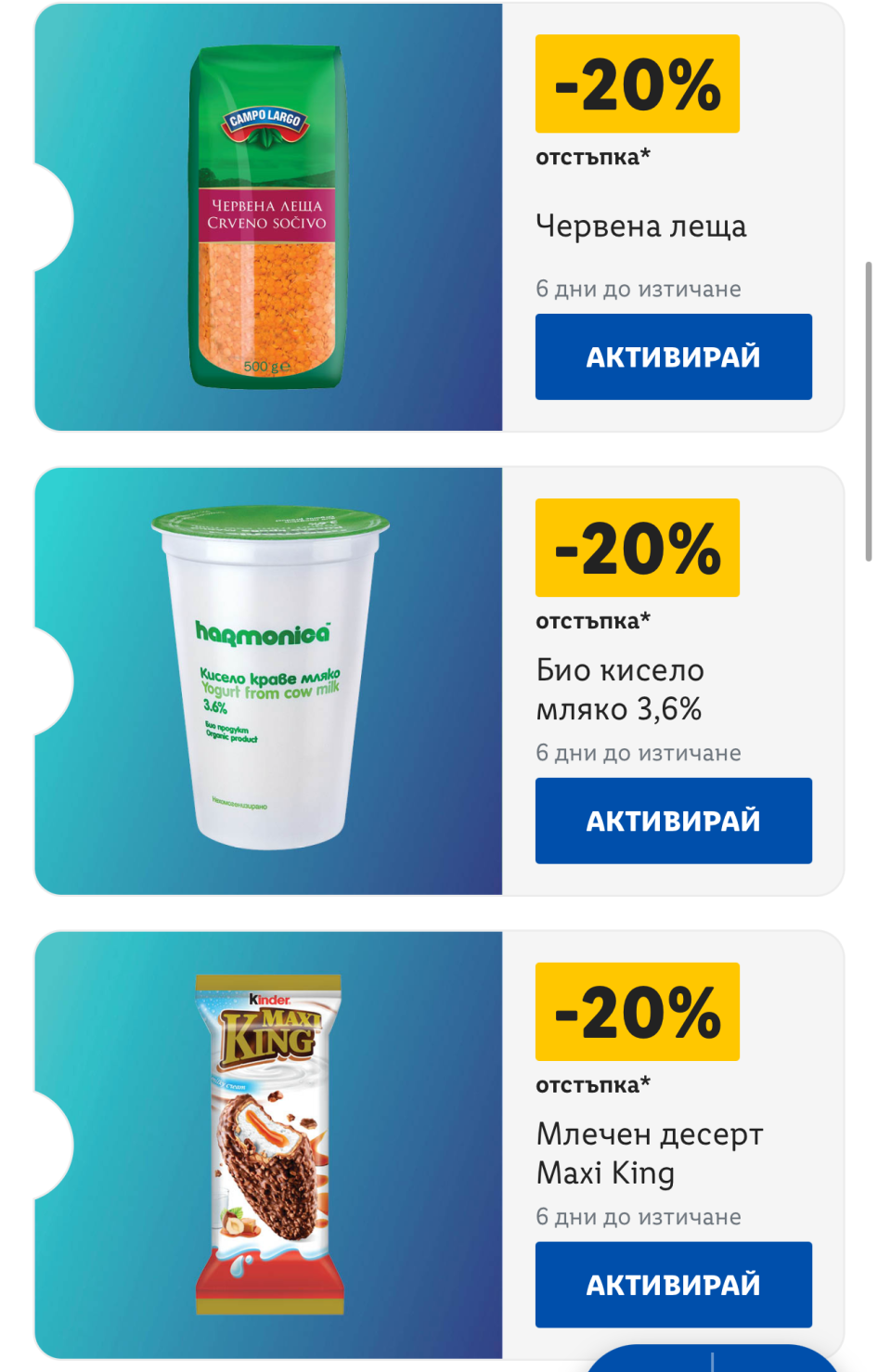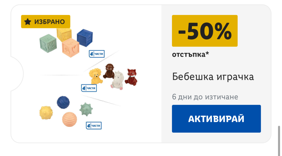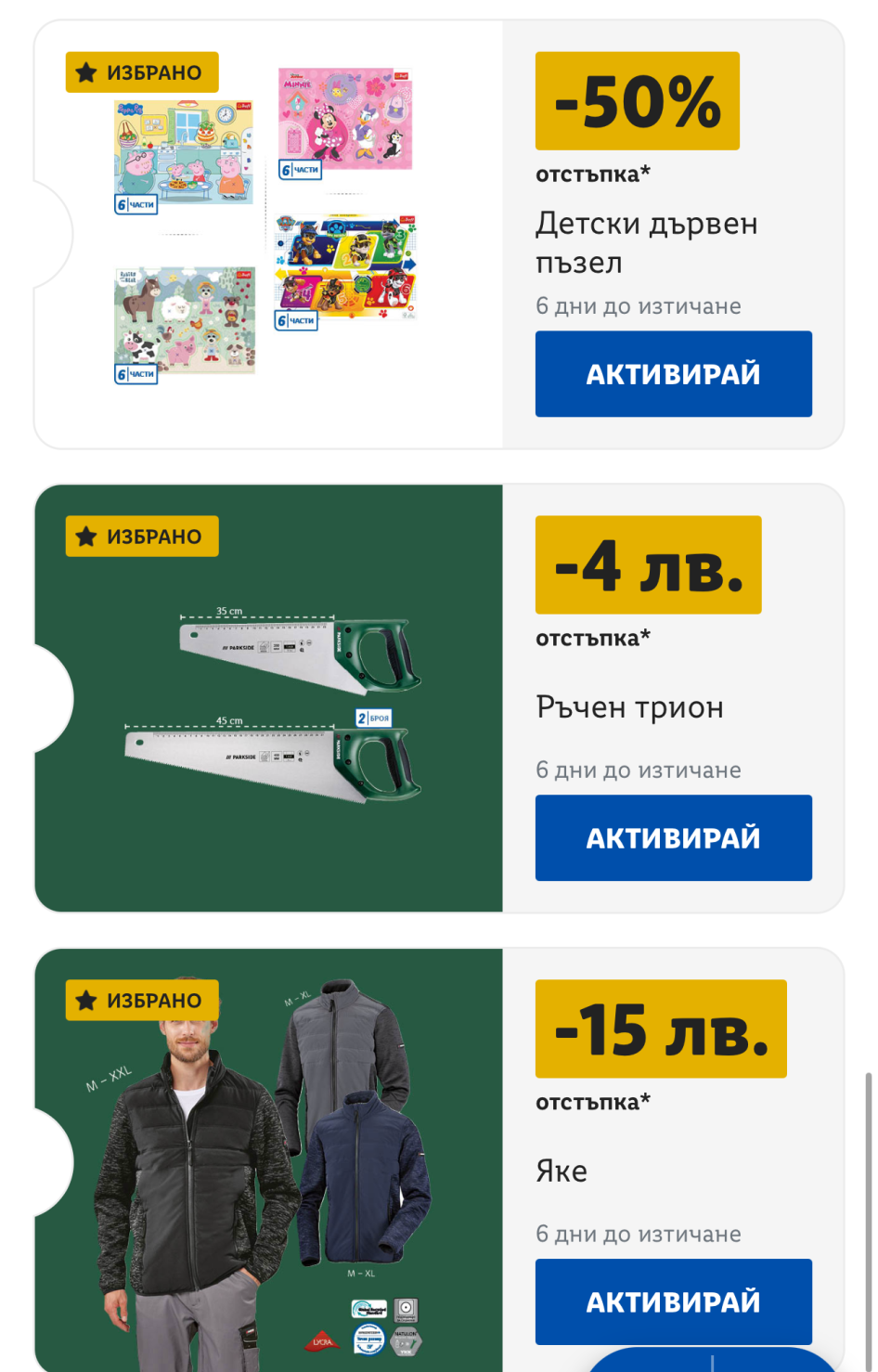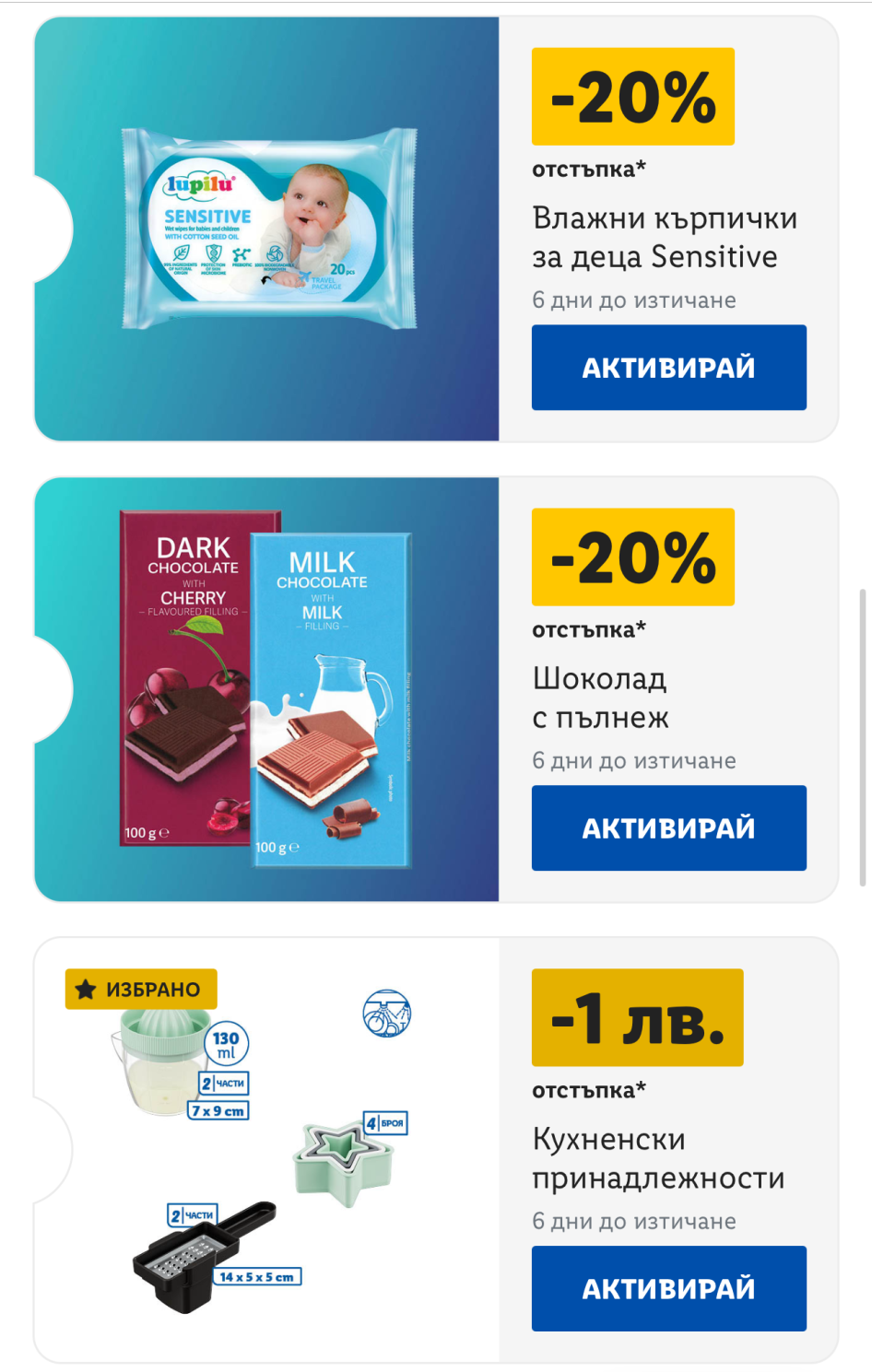 Оф, добре, оставям 500 лв + всеки месец в Лидл, не е като да не знаят какво купувам. Защо аджеба имам продукти на парксайд и то с "избрано" в купоните?? Същевременно всеки месец купувам памперси и мокри кърпи, нагоре гледам имате 50% на бебешки играчки, чорапи, пъзели ...  При мен естествено няма 😒 За хранителните дори не ми се говори - боза, вегета, пуканки и франзела. Такова в последните 5+ г не съм купувала 🤷🏻‍♀️