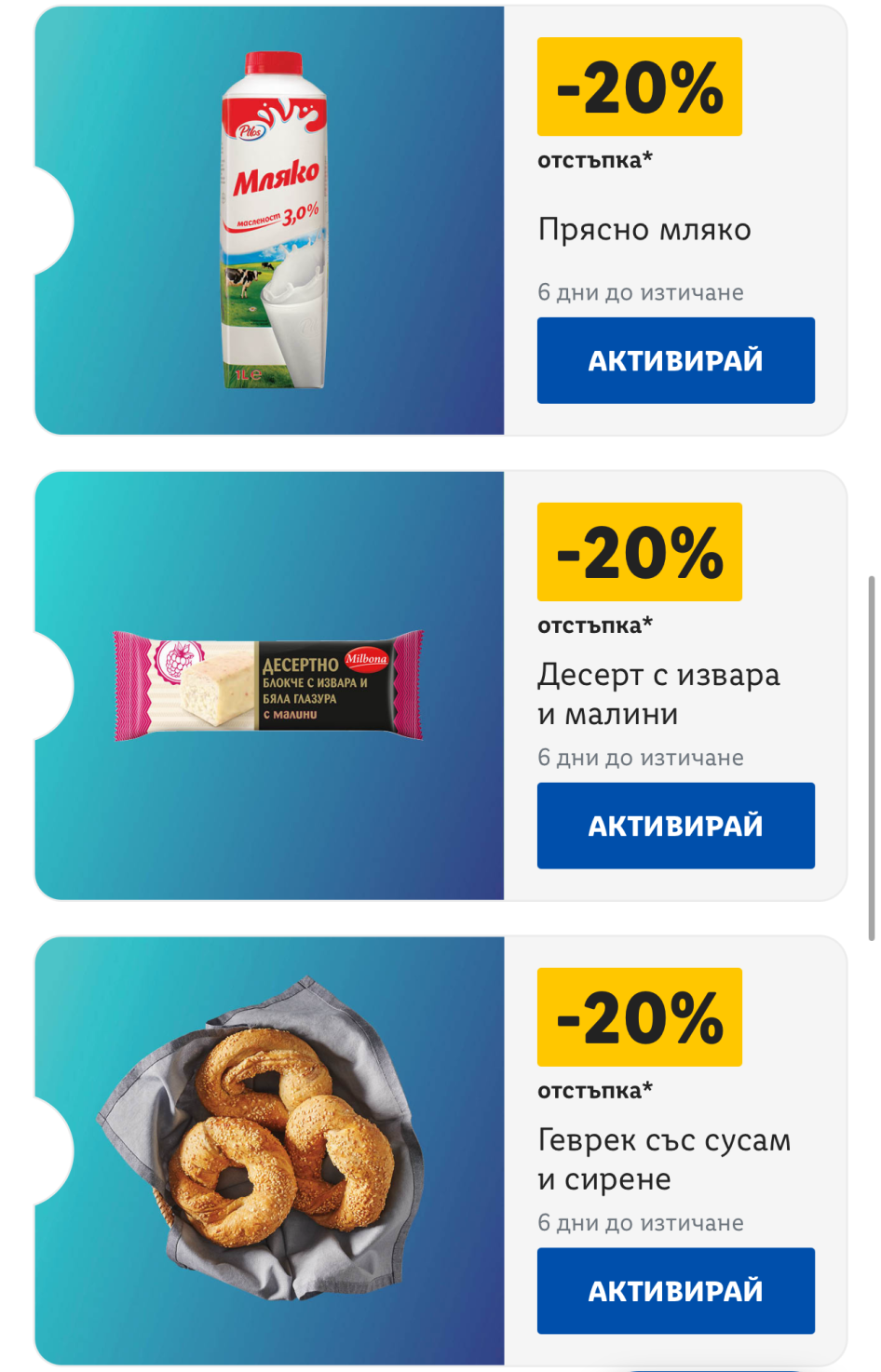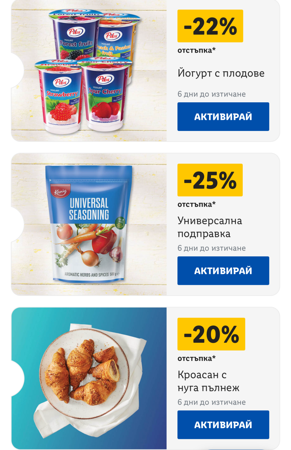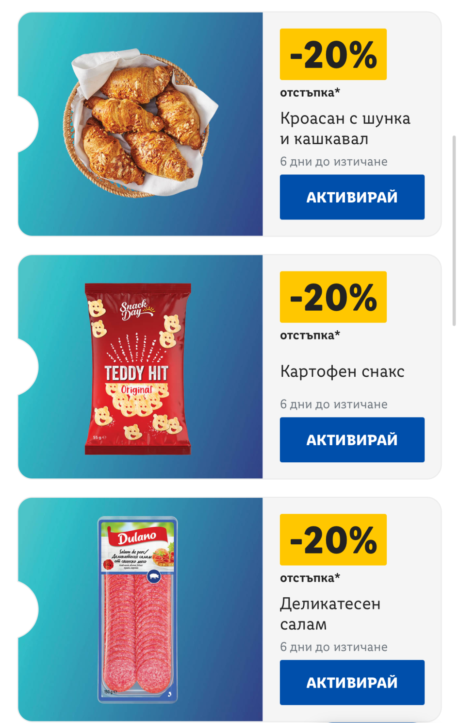 Оф, добре, оставям 500 лв + всеки месец в Лидл, не е като да не знаят какво купувам. Защо аджеба имам продукти на парксайд и то с "избрано" в купоните?? Същевременно всеки месец купувам памперси и мокри кърпи, нагоре гледам имате 50% на бебешки играчки, чорапи, пъзели ...  При мен естествено няма 😒 За хранителните дори не ми се говори - боза, вегета, пуканки и франзела. Такова в последните 5+ г не съм купувала 🤷🏻‍♀️