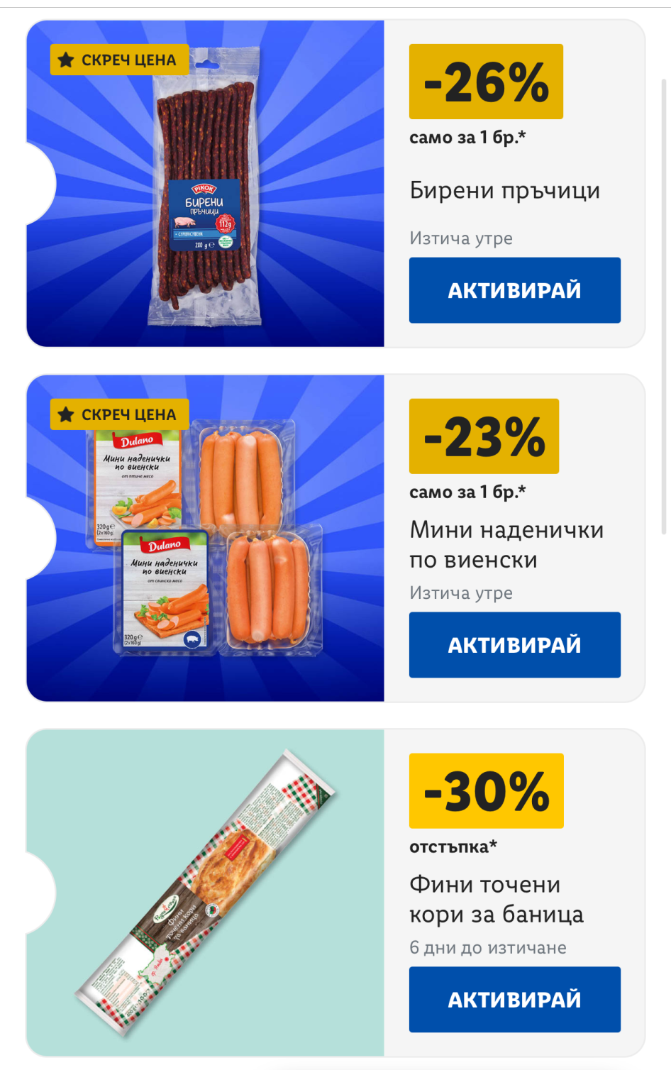 И на мен не ми достигат 22 лв до купона за 6лв отстъпка от следваща покупка. Ако някой иска, мога да изпратя картата ми да пазарува утре и после следващите 7 дни за да си ползва 6те лв ваучер. И аз заминавам пт утре и няма да посещавам Лидл.