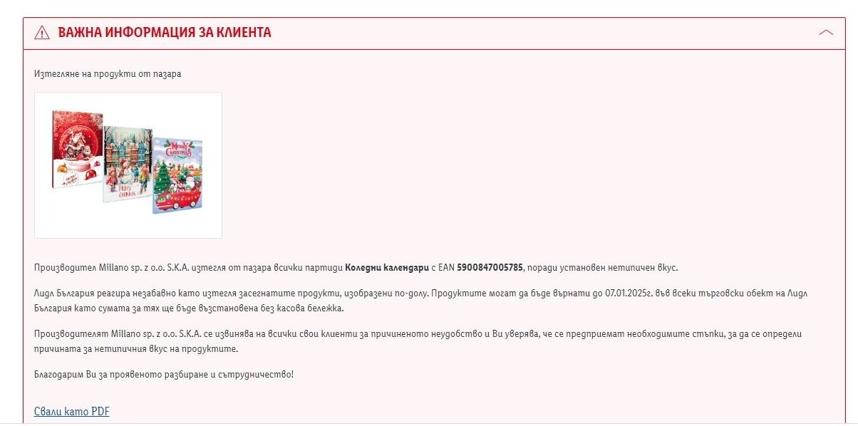 Вчера ММ отишъл, но служителката му казала, че е до 30 дни, а ние сме го купили веднага като пуснаха коледните неща, т е. края на октомври. На нашия филиал няма никаква бележка за изтеглянето. Не намерих и на сайта им информация.