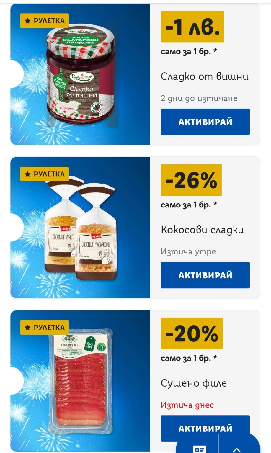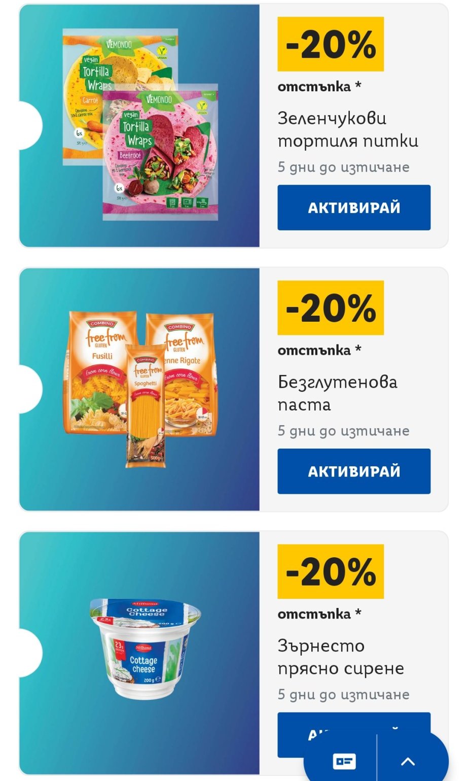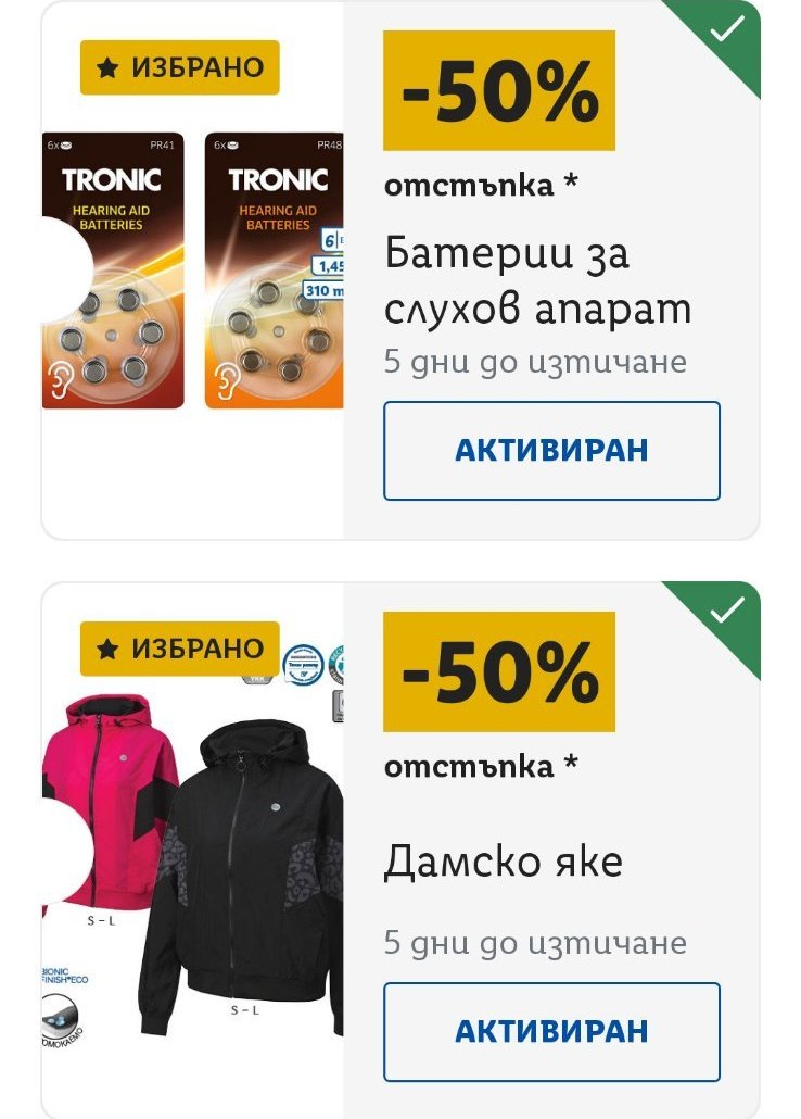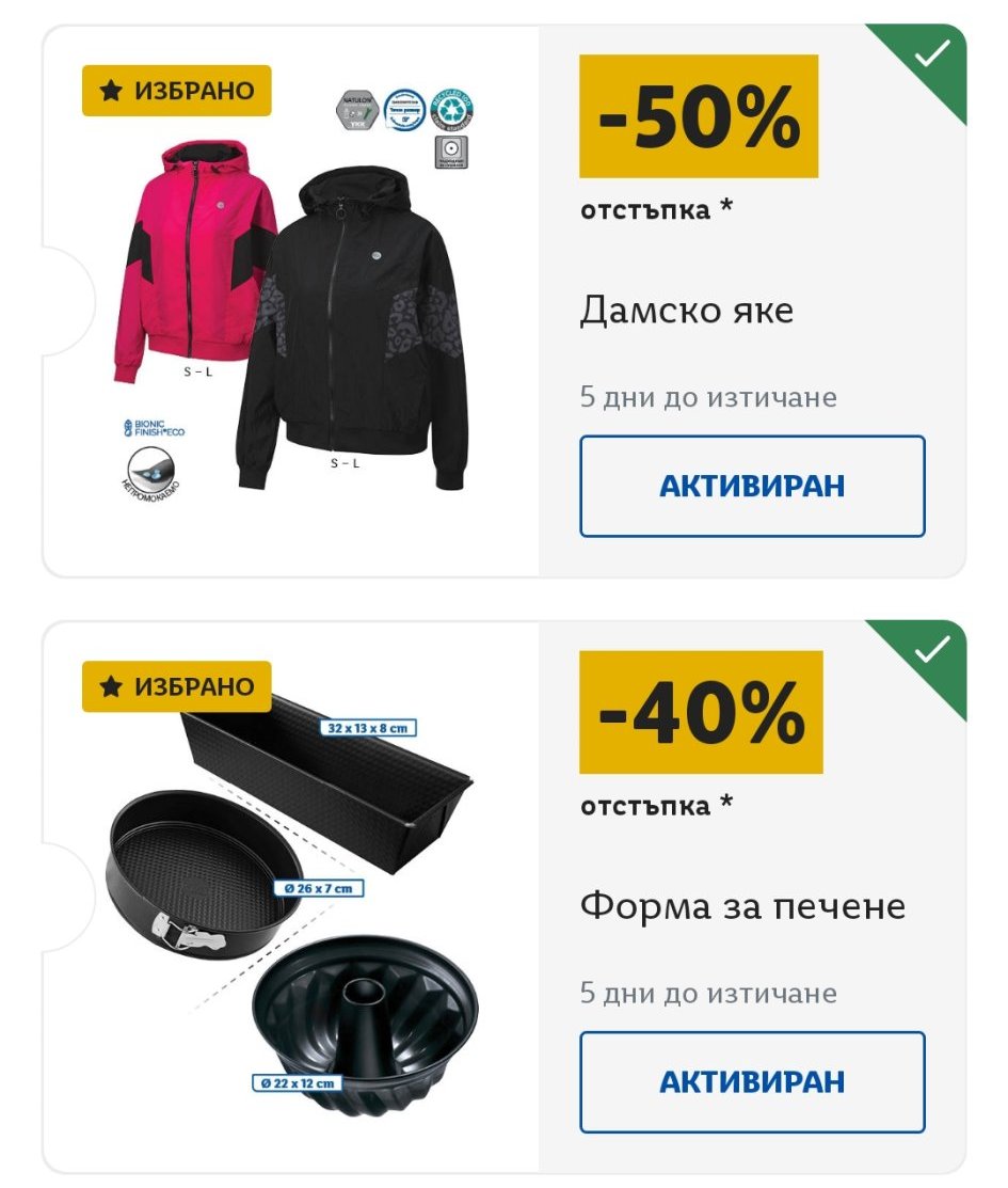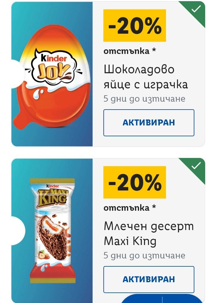 Иначе имам 16 купона,като половината са за хранителни стоки,а другите-мини масажор ,форми за печене,дамско яке,дамски топ,лед лампа...