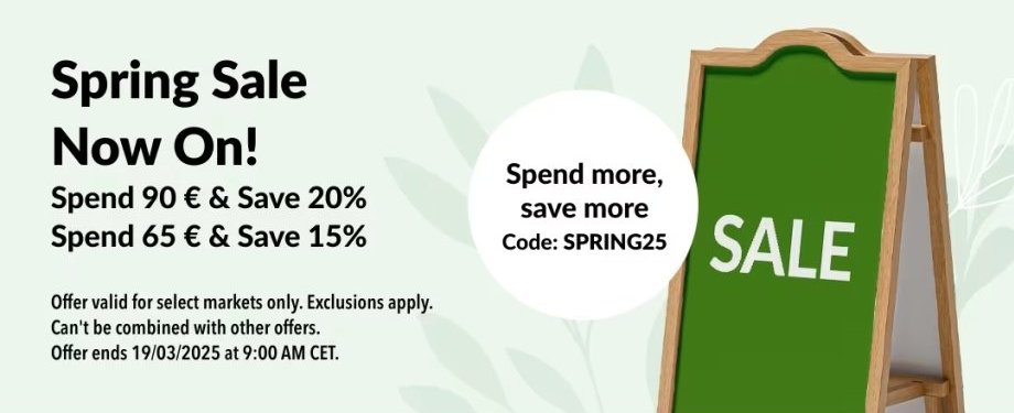 SPRING25 за 15% при поръчки над 65 евро и 20% при поръчки над 90 евро.