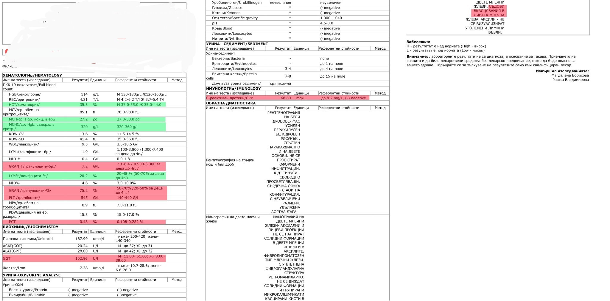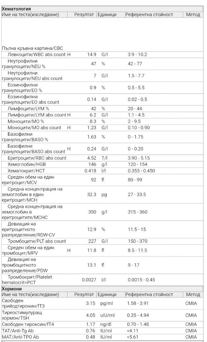 Здравейте.Някой би ли могъл да помогне с разчитане на изследвания на жена на 38 г.Виждат се високи стойности,дали има нещо много обезпокоително? Или към какъв специалист да се насочим?