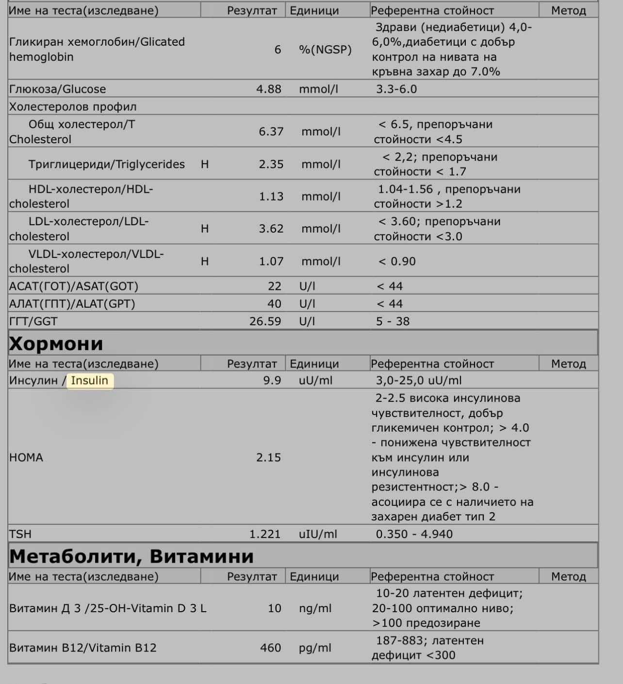 В предвид инсулина, холестеролите, дефицити на витамини е хубаво да се провери щитовидната жлеза. Виждам, че е изследван ТСХ, но той сам по себе си нищо не значи, той е хипофизен хормон, не щитовиден. Затова другия път когато се изследваш си пусни пълен панел хормони - ТСХ, Т4 и Т3, също желязо не виждам да си изследвала а е добре.