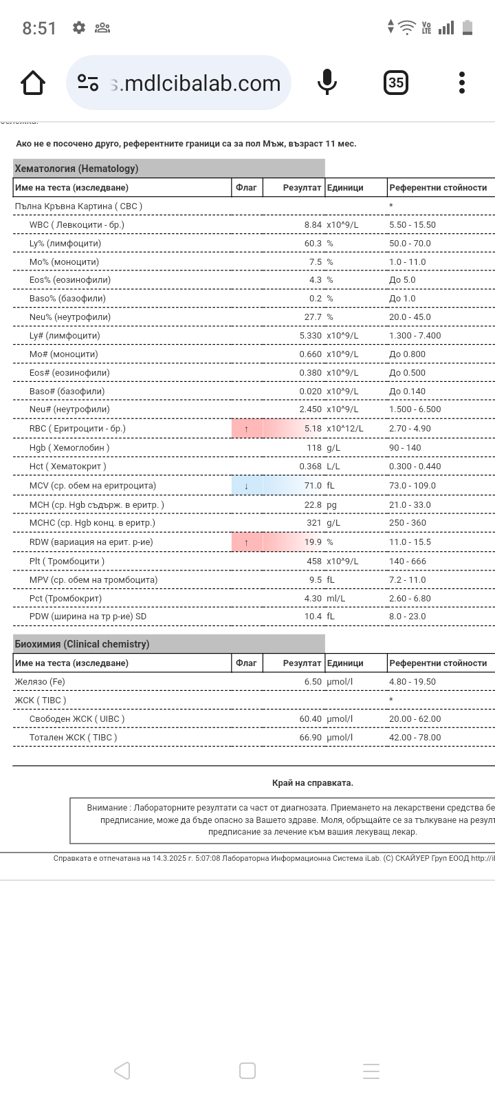 Здравейте, синът ми е на 11 месеца. При изследванията след 6-я месец беше диагностициран с желязо дефицитна анемия. Два месеца пи малтофер и преди месец го спряхме. Вчера правихме изследвания и това са резултатите. Моля, кажете има ли място за притеснения. Предварително благодаря.