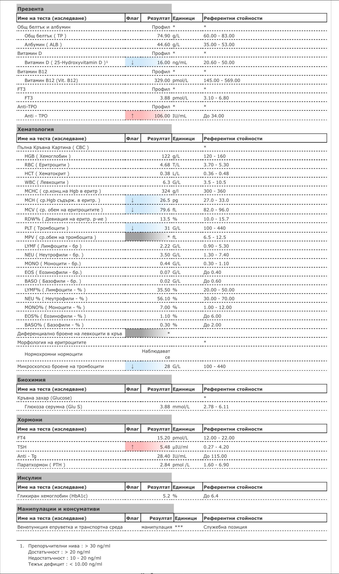 От 2г съм с отстранена щитовидна жлеза, приемам хормон 100мг, виждам че трябва да се повиши дозата. За тромбоцитите отново трябва да започвам кортикостероидите, но до там съм с разчитането, чакам доктора да ми отговори, но вече е извън работно време и до утре може да откача. Прилагам снимка на изследванията, благодаря предварително