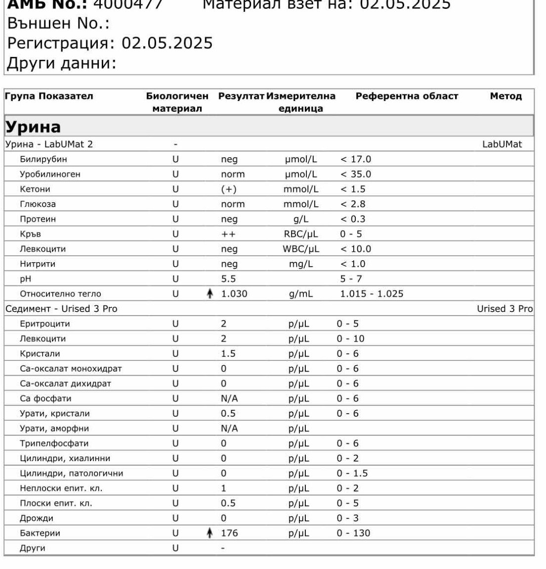 Ако са спазени - виждате сама, има много бактерии, както и кръв, кетони и завишено тегло. Инфекция, обезводняване, не добро хранене последно време (при деца и 1-2 дни са достатъчни). Изненадва ме липсата на увеличени нитрити и левкоцити при наличие на бактерии масово.