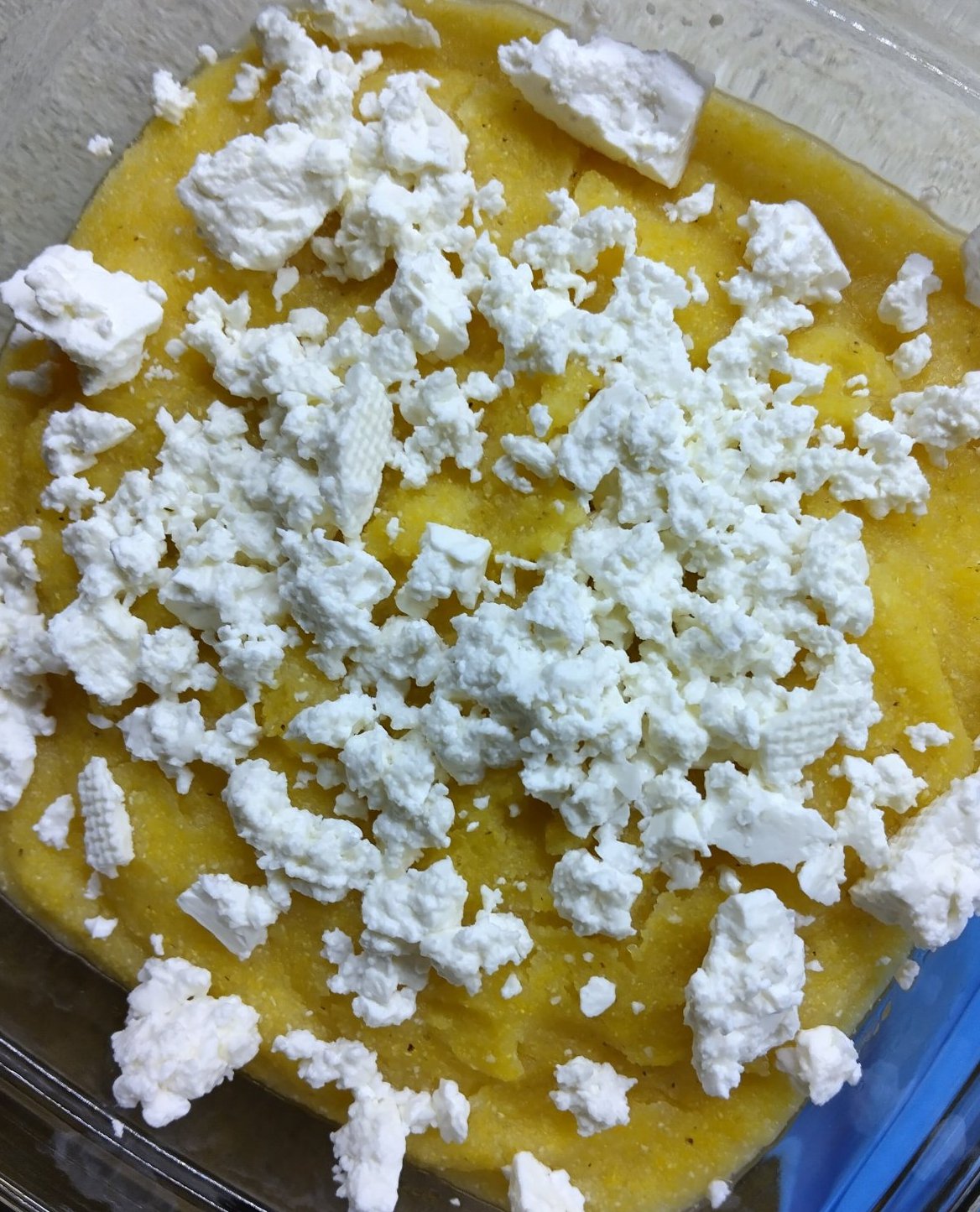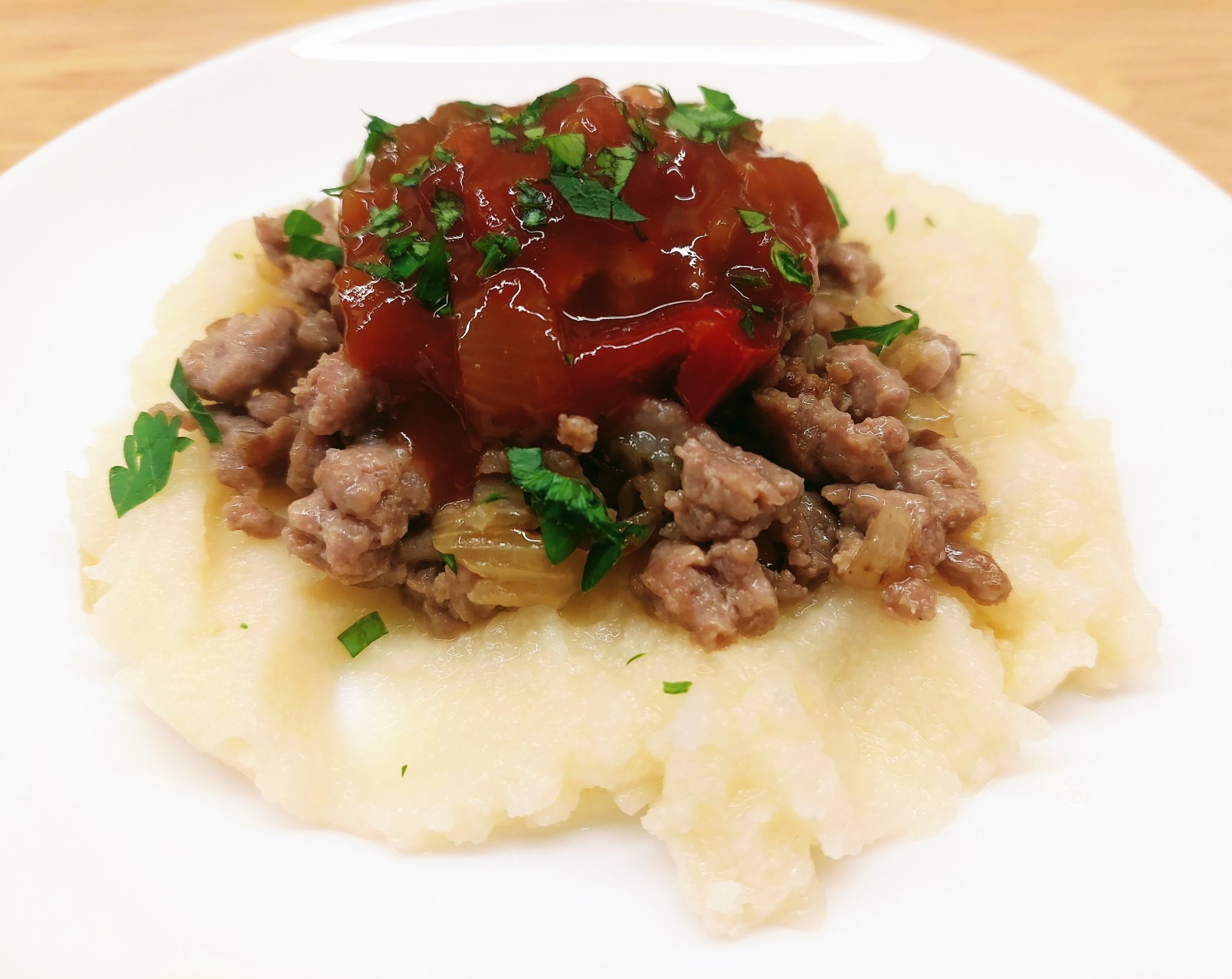 Оползотворих останало пюре от карфиол, като го гарнирах със запържена кайма с лук и сос.