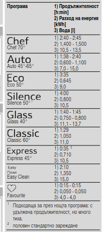 Моделът е хубав (едва ли има лош Neff), със зеолит и много екстри. Няма автоматично отваряне на вратата, което би било проблем единствено ако сте от хората, които държат изрично на тази екстра. За сметка на това, икономичната програма при тази съдомиялна е 3:35 ч., за разлика от моделите с автоматично отваряне, при които тя е близо 5 часа. Ето това са програмите на този модел: