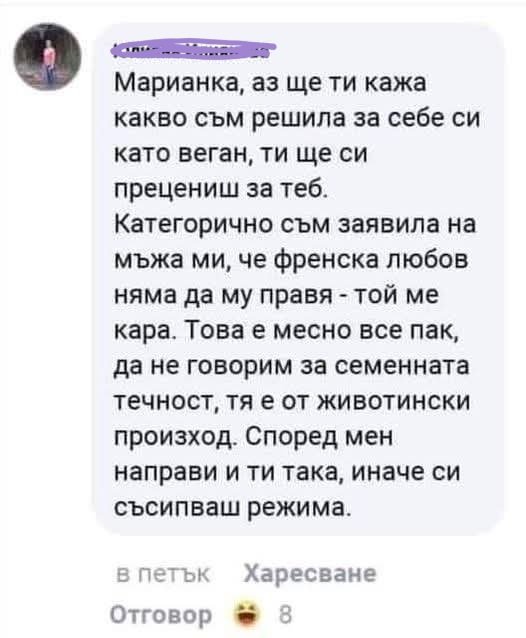 Абе вие не схващате ли, че и жената иска да е доволна? Тоест не може жената да осигурява свирка и мусака, и време за игра на плейстейшън. И тя иска свирка и мусака, и време да си чете. Е как да стане, като всеки иска?