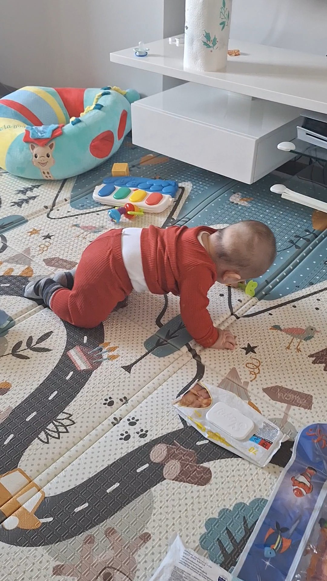 За сметка на това вече може да сяда самостоятелно. И да се изправя по мебелите. Пада непрекъснато, ако е с каската и на килима, добре, иначе рев и киселаж после. Почти не стои мирен на едно място. Никакви играчки не са му интересни за повече от 2-3 минути, няма търпение да проходи, иска да се катери. Изправя се и в кошарата (вече е на долното ниво). Не разбирам откъде идва тази енергия, при положение, че почти не яде твърда храна, а пък по усет вече е 8 кг. Излишно е да казвам, че вече ми е притеснено да го оставя без надзор и за 2 минути.