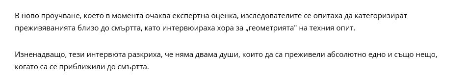 Завъртам темата ни с поредно изследване (и статистика) върху преживяванията в кома - т.е. извън тялото или т.нар. гранични преживявания. 48 души са били интервюирани, прев. от публ. на Дейли Мейл.