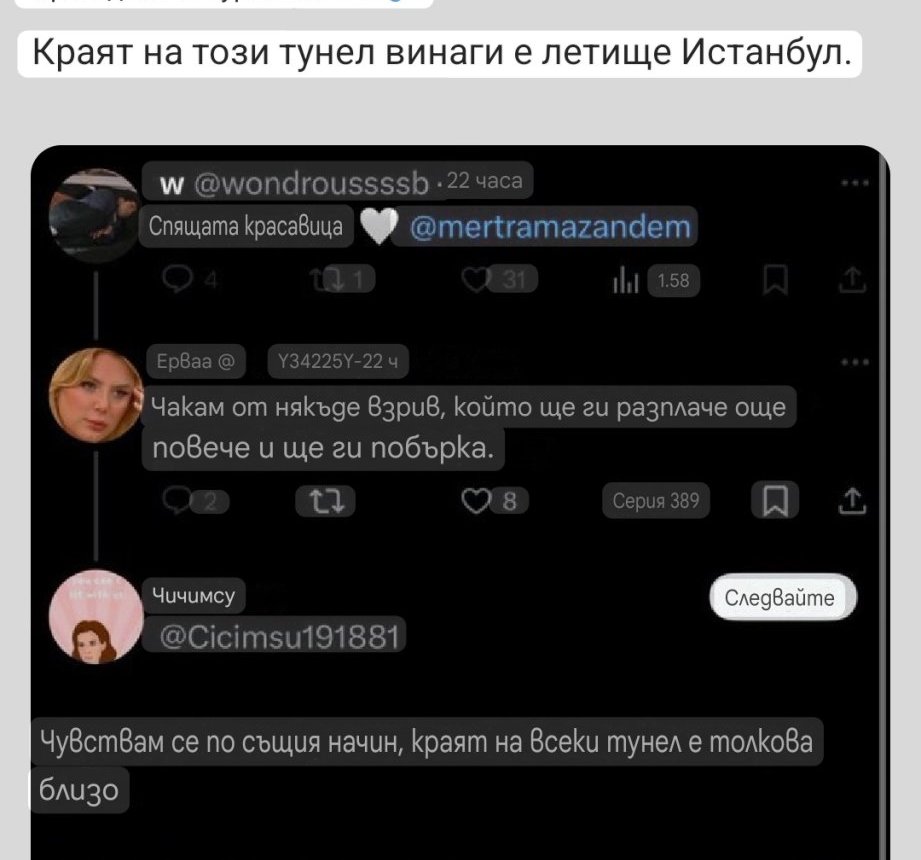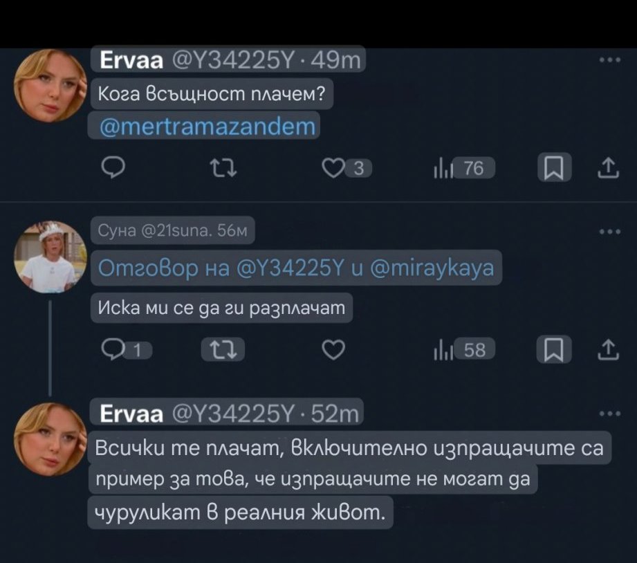 Днес се размятат насам натам тези скрийншотове. Разрових се в профила на едната злобарка. Тези всичка са с толкова малко останали мозъчни клетки, че си мислят, че феновете на Рибарчето не са харесали сценария, просто защото са накарали Мерт да се целува с Берил, а не с Афра.