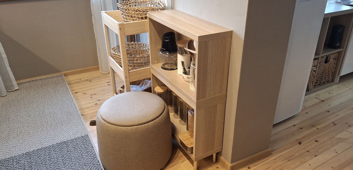 Аз пък да се похваля, че си огранизирах измислен кът срещу кухнята (тя е права) с икейски дреболии. Все ми липсваше нещо срещу нея. Например където да си разтоваря зеленчуците като се прибера от магазина. Ама и място за посядване ми липсваше когато готвя нещо дето изисква да не се отдалечавам много от котлоните. И стълбичка нямам, за да достигам горните рафтове на кухненските шкафчета. И ей така изведнъж събрах всичко нужно в асиметрична, хаотична композицийка светло дървесно и бежово. Една икейска табуретка с място за съхранение влезе в ролята хем на място за присядане, хем на средство за достигане на височините. Не ме интересува, че в кухните табуретки не се слагат. Аз пък сложих. Толкоз. Интересното е, че останах доволна.