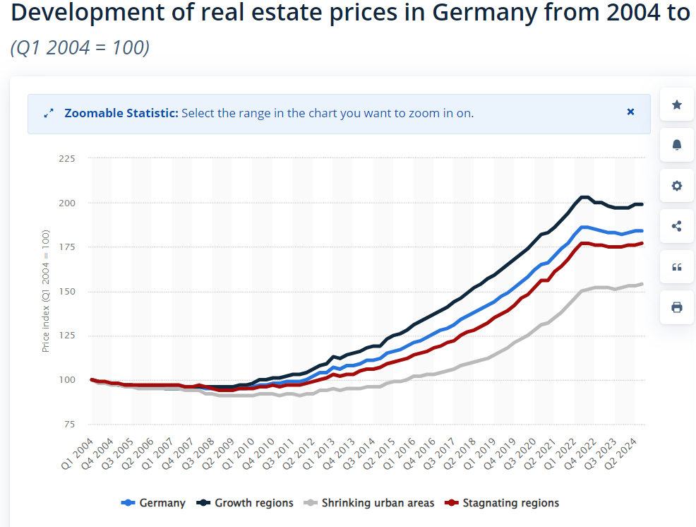 Да, има. Ето например Германия - за 20 години (2004-2024) общо средният индекс на цени на жилища е скочил от 100 на 180.