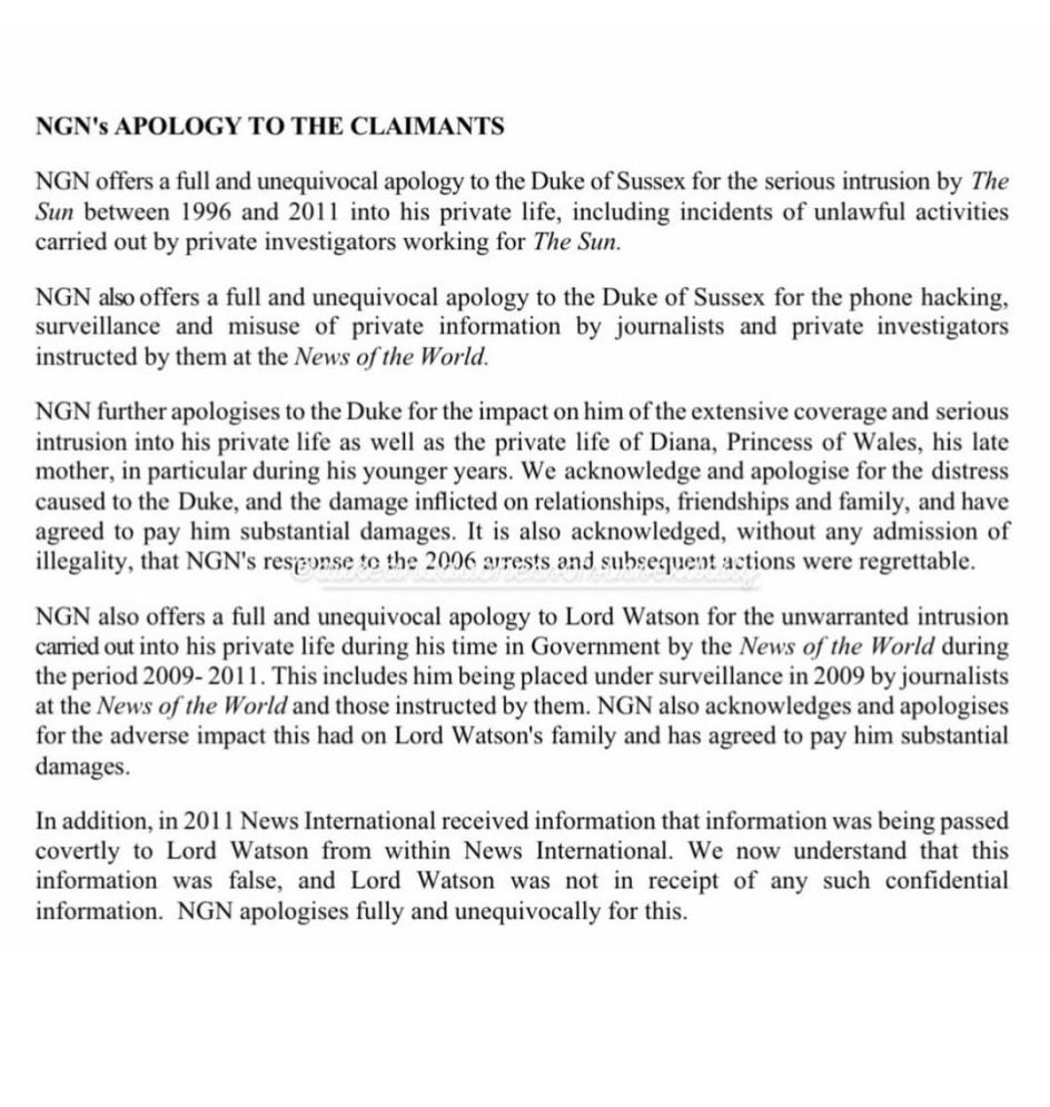 NGN освен това се извинява на херцога за въздействието върху него на широкото отразяване и сериозната намеса в личния му живот, както и в личния живот на Даяна, принцеса на Уелс, неговата покойна майка, особено в по-младите му години. Признаваме и се извиняваме за притеснението, причинено на херцога, и за вредата, нанесена на взаимоотношенията, приятелствата и семейството, и се съгласихме да му платим значително обезщетение. Също така се признава, без да се признава каквато и да е незаконност, че отговорът на NGN за арестите през 2006 г. и последващите действия са били достойни за съжаление.
