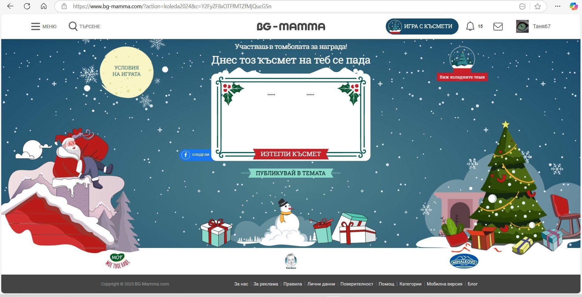 И на мен ми се падна онзи ден, мислех, че просто не се показва на момента, но като видях, че и в публикация не излиза, си изтеглих друг. Grinning По принцип винаги тегля само по един и не ми стана приятно, че трябваше да тегля пак, но явно е някакъв бъг. И се сещам, че уж обещаха за следващата игра да оставят само нормалните късмети, без такива, генерирани от изкуствен интелект. Та да се надяваме, че в следващата новогодишна игра всичко ще е наред.