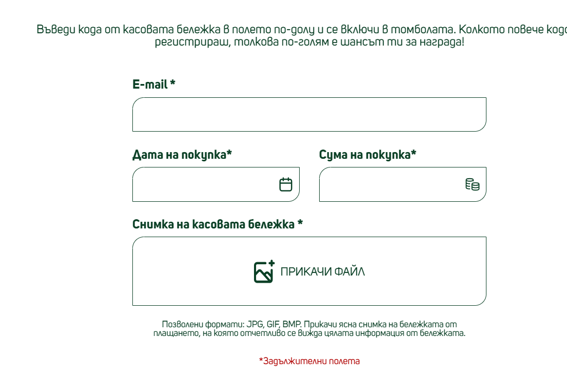 И още един въпрос. Опитвам да регистрирам бележка в играта на Била и сокове Флорина. Излизат ми за попълване само имейл, дата на покупката, сума на бележката и снимка. В правилата пише, че се попълват и имена и телефон и съм сигурна че днес като проверявах имаше такива полета, а сега не ми излизат. Може ли някой да провери дали му излизат полета за имена и телефон? Благодаря. Blush