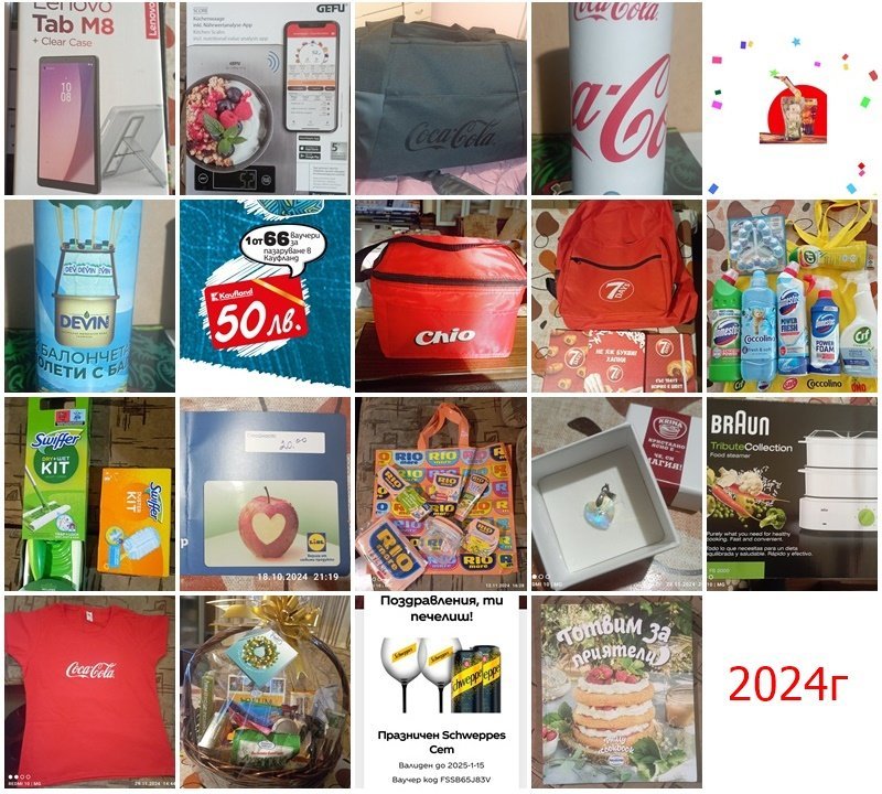 Ето отчета ми за миналата година,първата награда ми е от началото на годината,всички други от второто шестмесечие,от когато ви открих и играя по активно.Не съм получила още чашите от швепс,но са в колажа .Дори мисля че няма да ги получа,защото дадах офис на еконт и личен адрес,а не Спиди каквото беше искането.