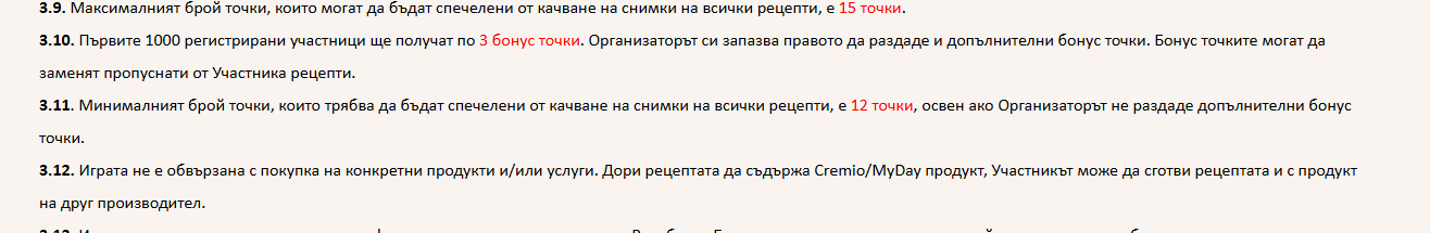 3.10. Първите 1000 регистрирани участници ще получат по 3 бонус точки. Организаторът си запазва правото да раздаде и допълнителни бонус точки. Бонус точките могат да заменят пропуснати от Участника рецепти.