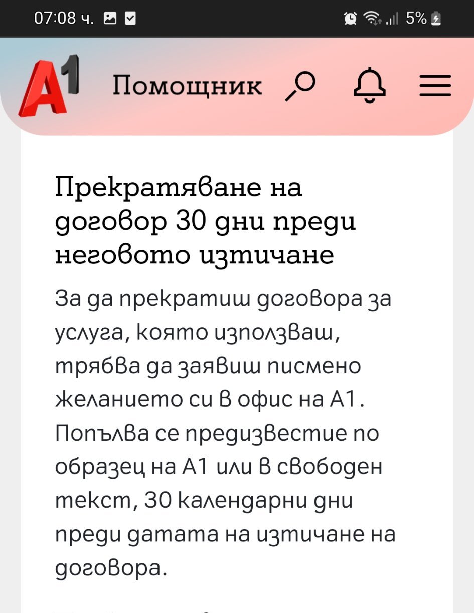 Нене, това е съседка, иска да прекрати този договор с А1. Вече има друг номер към Йетел. Или от преди това има, не знам. Каша ѝ е някаква и помоли да разбера какво да прави. Ами, ако е така с предизвестията, ще си плати ,какво да прави, но иска да го спре този номер и да се отърве от него. Благодаря на всички за коментарите. Утре като иде, ще разбера и аз какъв е случая, но поне да е подготвена, че вероятността да има И предизвестие, е голяма.