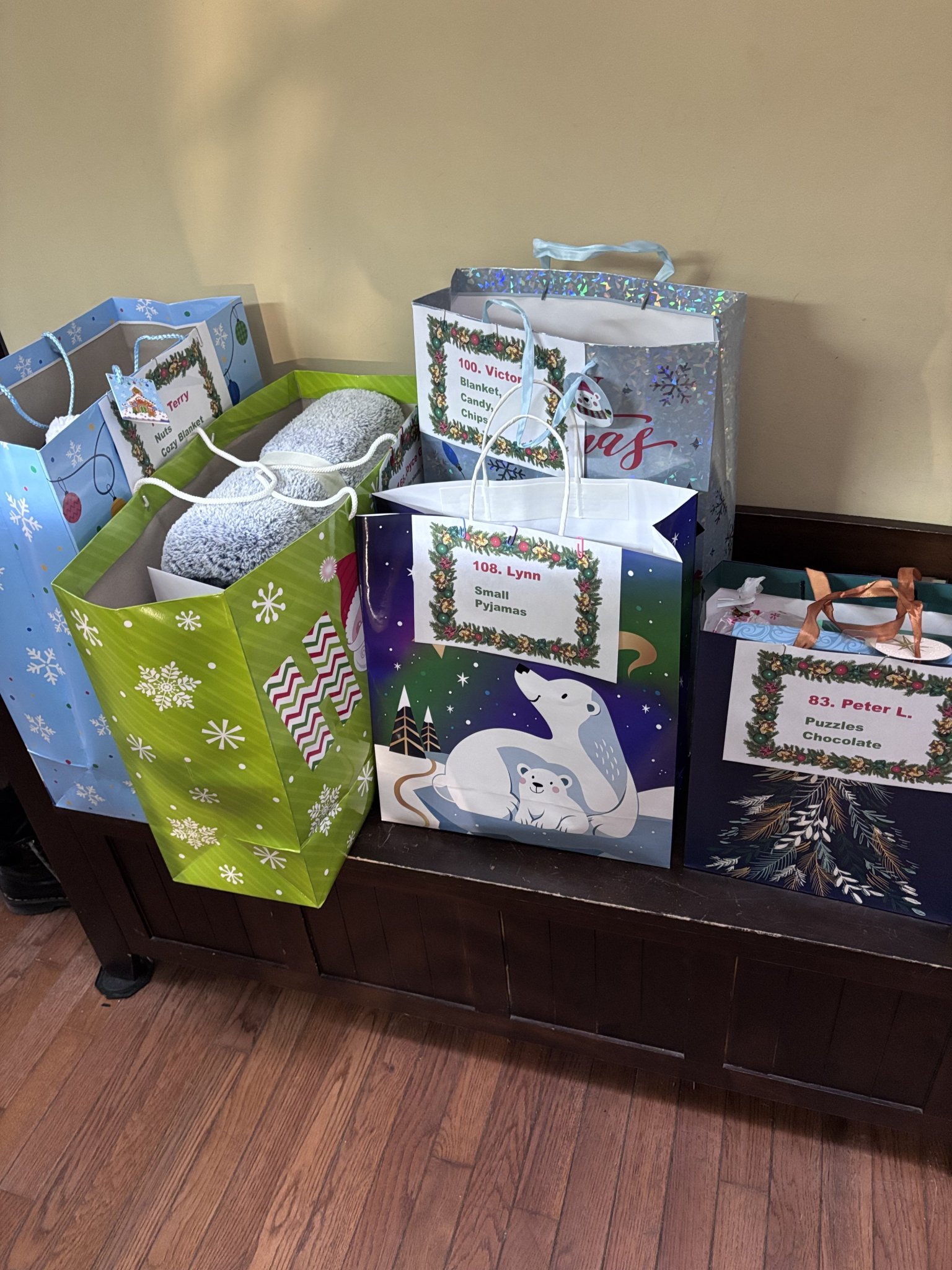 Аз току що приготвих торбите с подаръци за възрастните хора, имам пет тази година. Колегите също допринесоха с подаръци.