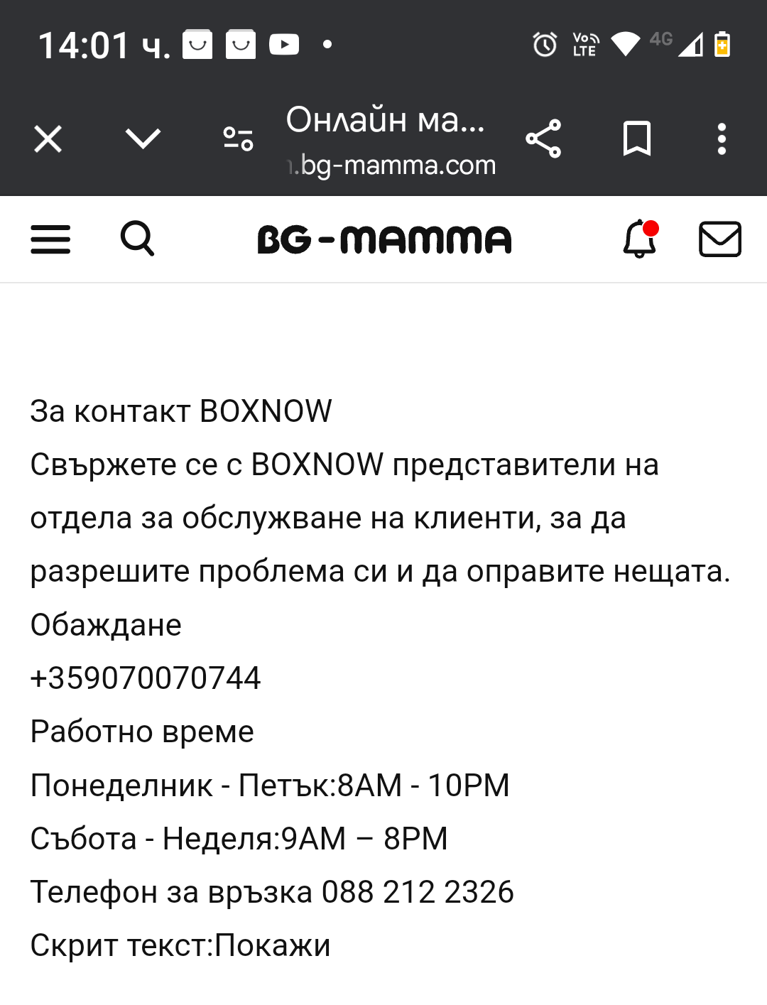 Имам записан телефона на Бокснау, но не съм го ползвала. Пренасочвам пратки, които трябва да получа с BoxNow, като им пиша, не им се обаждам по телефона. Към всяка пратка в Тему има бутон Проследяване, съответно се стига до бутон Свържи се. Попълвам формата за връзка, пиша на кой адрес (автомат) искам да бъде пренасочена пратката. Много бързо реагират и на viber изпращат съобщение, че пратката ще бъде пренасочена на искания от мен адрес.