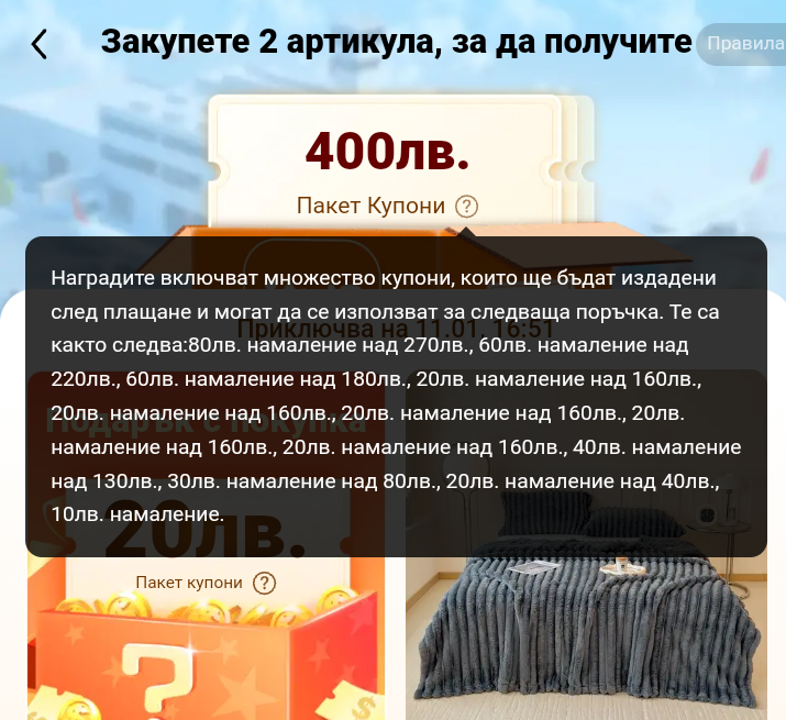 Избрах си аз два продукта за 16лв. и ми даде купони, които не ми харесват. И аз анулирах поръчката. Ми аз такива купони си имам от преди. Сигурно, за да даде хубавите е трябвало по-скъпа поръчка. Колко не е ясно. Като я анулирах. Ми даде отново тази оферта, но вдигна мизата на купоните на 400лв.