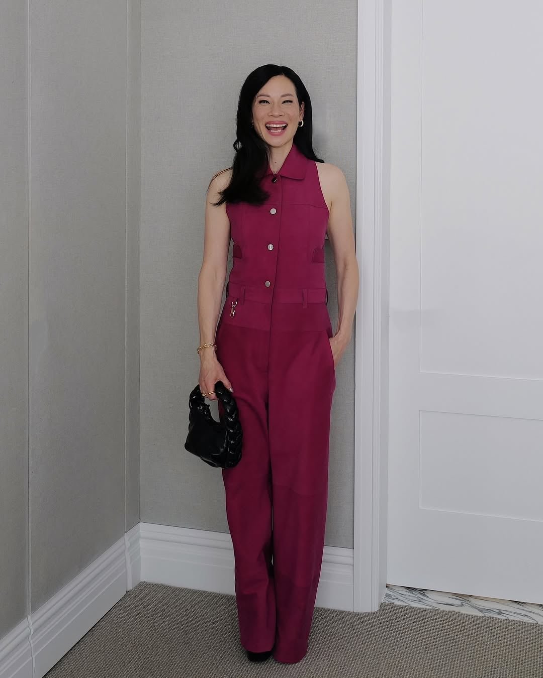 На Луси Лиу много ми харесва гащеризонът и цветът много ѝ отива.