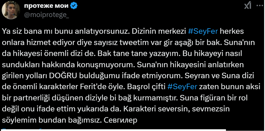 На мен ли го казваш? Центърът на поредицата е #SeyFer, имам безброй туитове, в които се казва, че всеки им служи, погледнете по-долу. Историята на Суна също е важна в сериала. Нека пиша едно по едно. Не говоря за това как са представили тази история. Докато разказвам историята на Суна, не казвам, че открих ПРАВИЛНИТЕ пътища. Сейран и Суна са важни герои в сериала, както и Ферит. Главната двойка, #SeyFer, не е установила връзка със сериала, който смята за противоположно партньорство. Както казах по-горе, Суна не е допълнителна роля. Моята поговорка „може или не може да харесвате героя“ е независима от това. Любовници