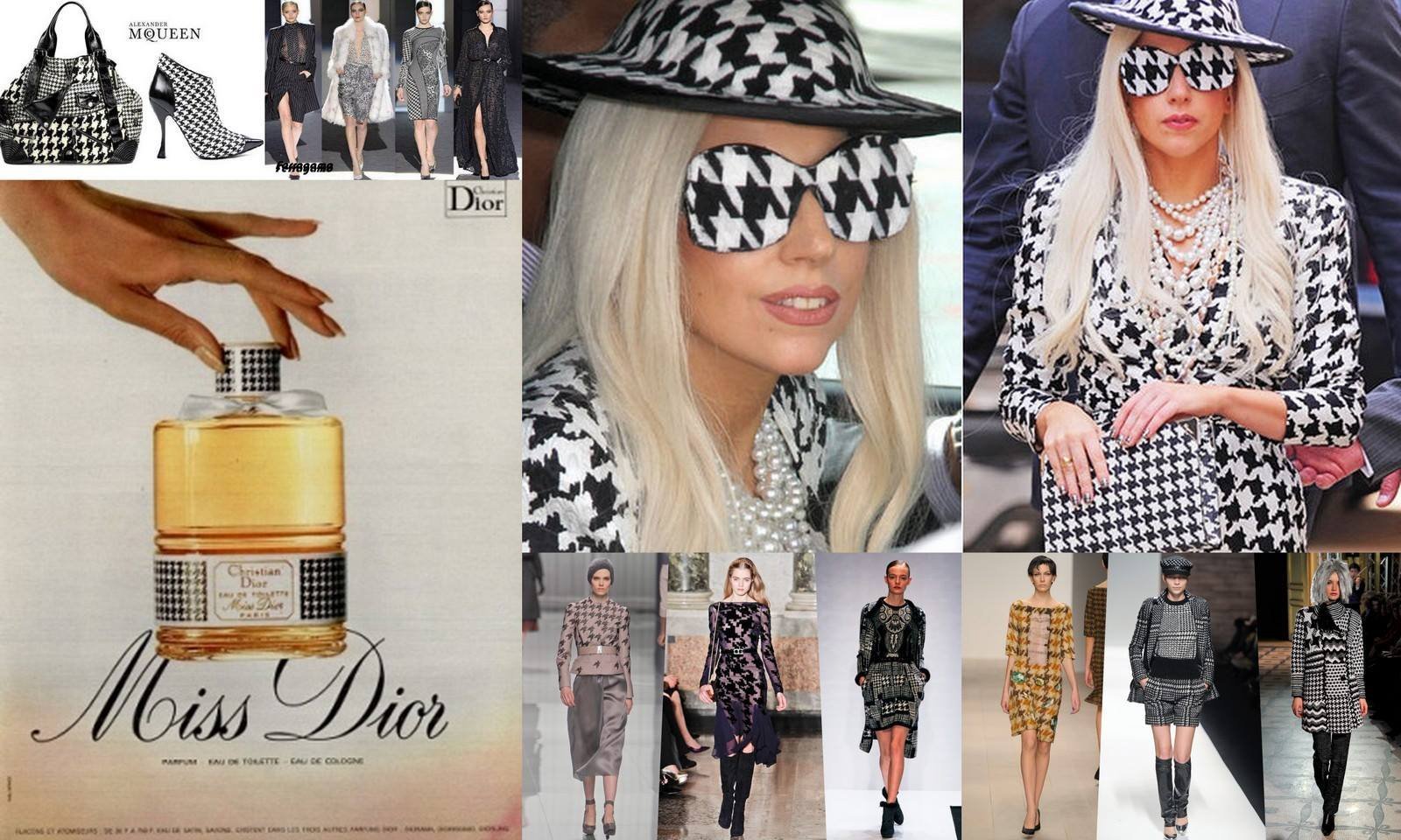4. Pied de poule от Диор до Ферагамо: 1947 година е годината на New look  на Кристиан Диор. Именно тогава големия дизайнер издига pied de poule като синоним на финес и стил, решавайки да „облече“ своя най-известен аромат Miss Dior. Парфюма, създаден в чест на неговата сестра, преминава през етапи на търсене на нова визия и през 1950 година, докато е ангажиран със своята колекция “Verticale”, Диор смята че е настъпил момента да промени външния вид на флакона. За първата поява на модела pied de poule за Miss Dior, дизайнера създава матови и гланцови отблясъци върху гравиран стъклен флакон, за да изведе на преден план двойствеността на оригиналния парфюм. От този момент, оптичната шарка бива приета и предлагана от различни дизайнери, които с времето я превръщат в истинска тенденция. Решителни за успеха на pied de poule се оказват 60-те години: благодарение на един любопитен и методичен поглед към бъдещето, група млади художници създават арт движение, чийто фокус са оптичните илюзии. Движението се нарича Optical Art. Модата не може да живее без вдъхновения, така дизайнери като Карл Джордан и Роберто Капучи създават дрехи с текстуиран триизмерен ефект, сред които е и pied de poule, който добива все повече популярност. През последните десетилетия, оптичния мотив бива преоткриван множество пъти и интерпретиран дори за създаване на спортни облекла. През 1990 година, стиловете са толкова различни, че термина „тенденция“ почти бива архивиран, и точно тогава марки като Chanel, Louis Vuitton, Emporio Armani и Moschino, използват pied de poule за колекциите си, като по този начин печелят звездите от червения килим. Малко по-късно Chanel, Albino, Moschino отново връщат шарката върху облекла тип панталони, сака и рокли. Колекцията на Alexander McQueen, който през 2009 година използва щампата, покривайки изцяло телата на своите манекенки с нея, е по-скоро осквернителна. През 2012 година Салваторе Ферагамо, в своята колекция есен/зима, изкарва на модния подиум като total look иновативен pied de poule, координирайки облекла, чанти и обувки и предизвиквайки реална тенденция за сезона. Лейди Гага бива изкушена от щампата и се появява в марков total look pied de poule, именно на дизайнера Ферагамо.