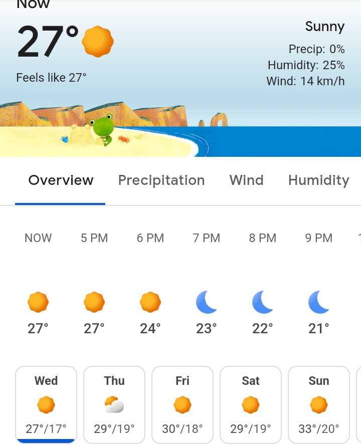 Между 25 и 30 в най-топлите часове от деня. 15-17 нощем.