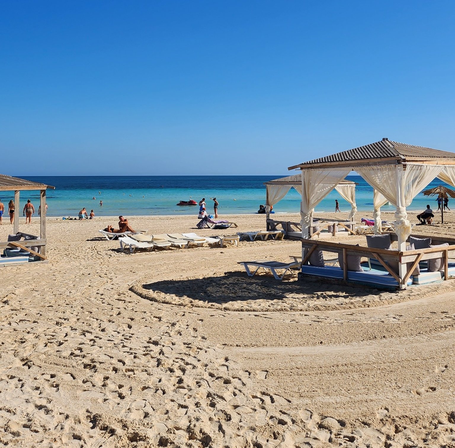 Привет от Джерба, в момента е 34°, жега. Радвам се, че случихме на време. Морето е топло, много красиво и чисто. Всичко освен храната е перфектно, стаите, чистота, интернет, персонал, но ние си знаехме за храната. Еклерите им, фурмите и зехтина са страхотни.Бих се върнала, но в някой 5 звезден  хотел.