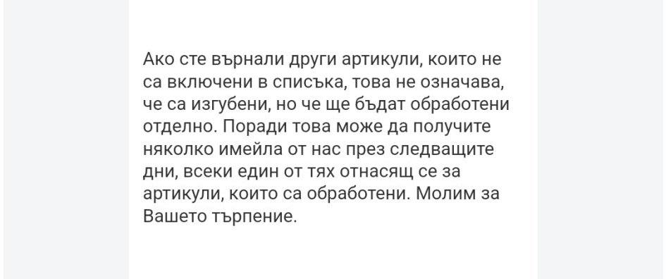 Имам нужда от съдействие или по-скоро съвет. Върнах наведнъж 4 пратки, всяка с готовата си товарителница. За 2 от тях вече получих мейл с потвърждение на връщането. За другите 2 обаче вече втори ден нямам мейл. Знам, че срока е 14 дни и все още не е минал, но все пак.