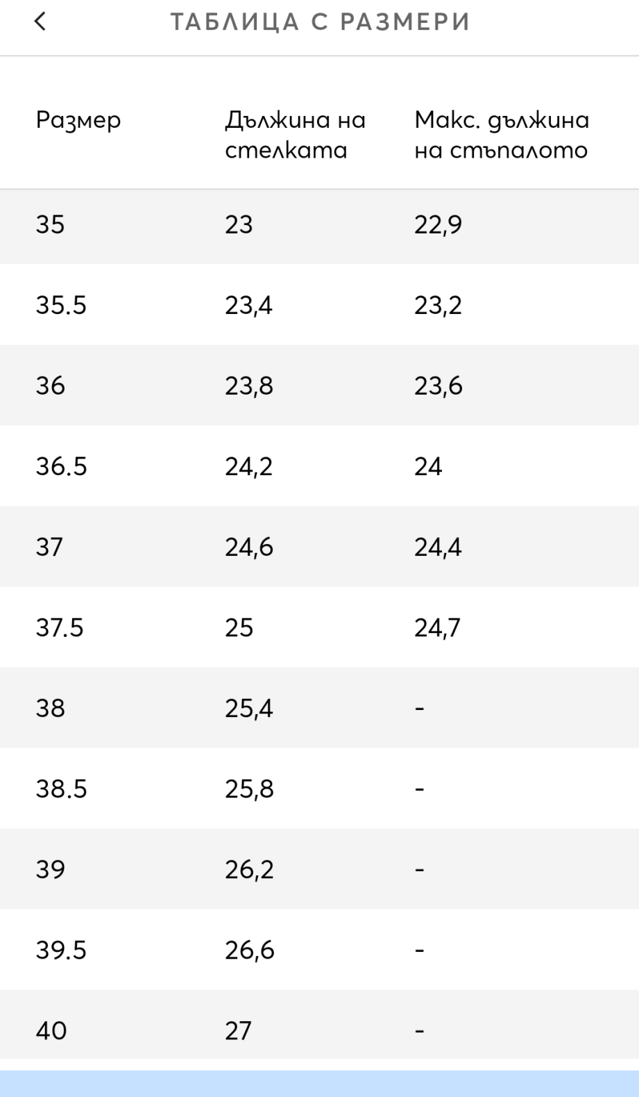 Ето размера на стелката от сайта на Обувки: