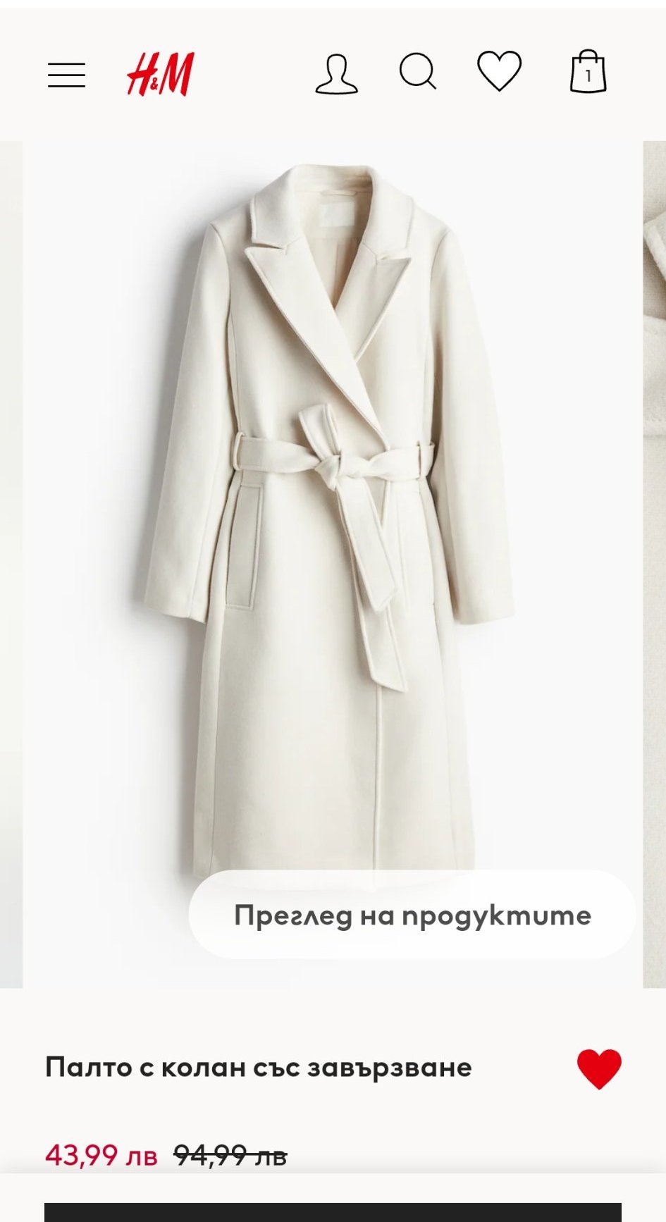 Бяло дълго палто с колан получих днес от HM за 43 лв, страхотно.