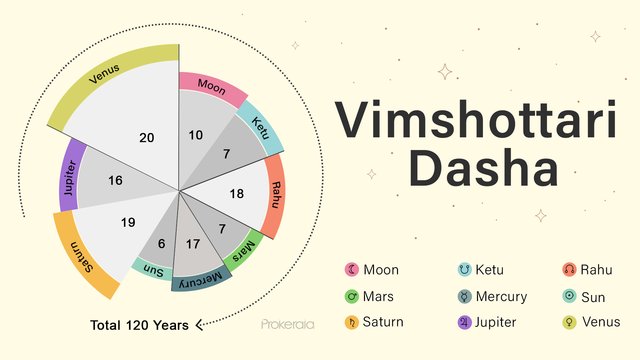 Във Вимшотари даша централно място заема накшатрата на Луната. Като отправна позиция. Първият главен период след раждането е повластен на управителят на нейната накшатра. В случай, че това е Венера - той включва 20 години. Продължава с този на Слънце - 6 години ...