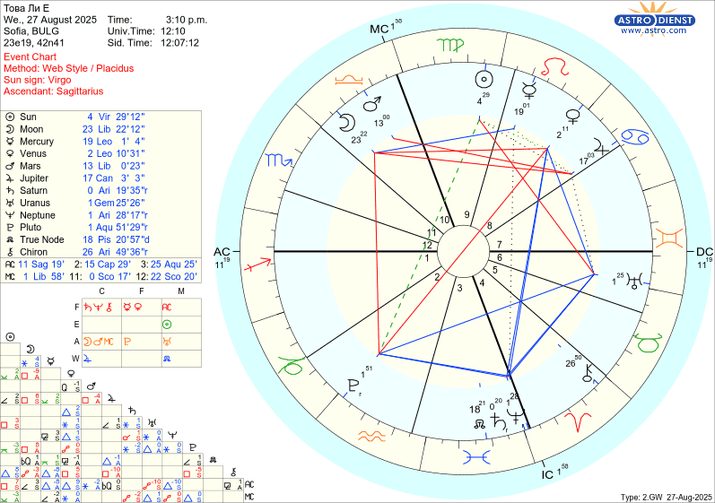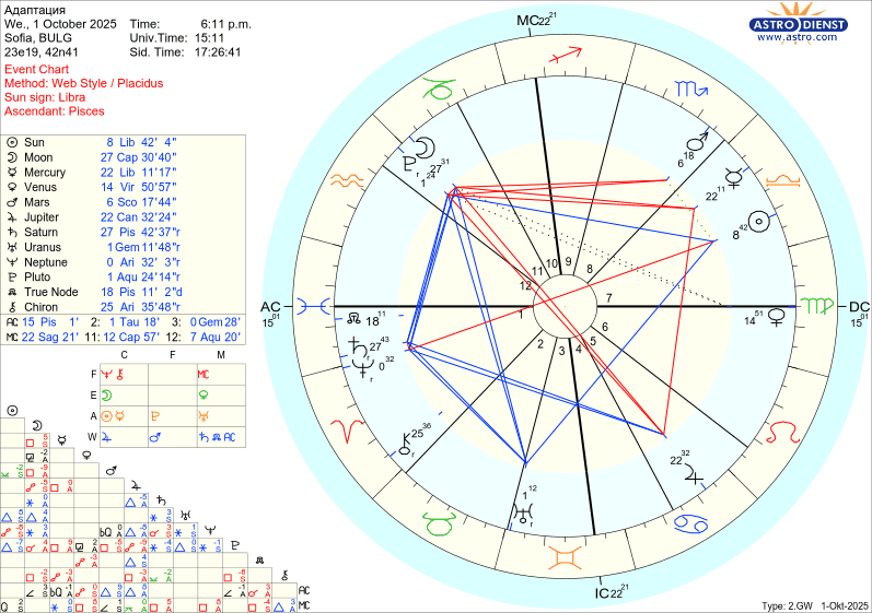 Меркурий (той) сходящ тригон асцедента и хирон - може би има потенциал за общуване, което да доведе до " излекуване" на ситуацията и думите, които си казахме. Но дали е достатъчно? Като цяло луната показва предстоящо напрежение, ще прави и квадрат с Плутон.