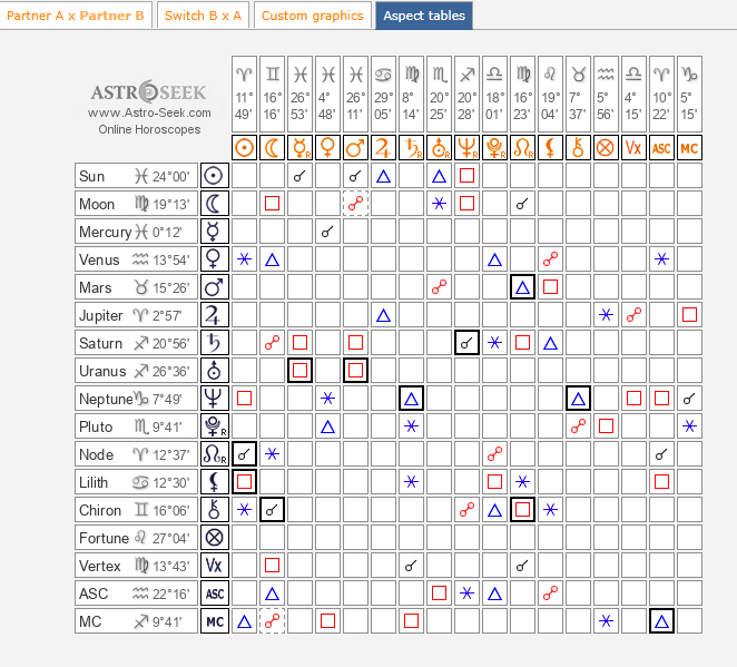 Дали някой може да погледне тази синастрична карта и аспектите и? Аз до някъде съм ги разтълкувала, но ми се иска да чуя още едно мнение. Може ли да се говори за "сродни души"? Няма да се женя за този човек, имаме разминаване в тайминга за брак и деца, но съм силно привързана към него и романтично и ментално/духовно и физическа химия има.