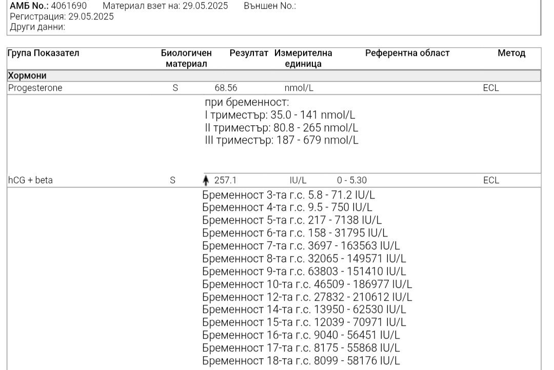 Резултатът излезе утре трябваше да ми дойде , реално все още нямам закъснение .. как са резултатите момичета , прогестеронът не е ли малко нисък ??? Другото което е резултатът не само че се е удвоил от ЧХГ , но почти се е утроил това добре ли е ?