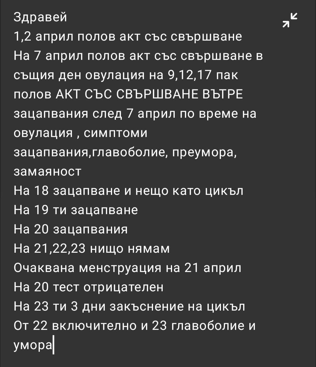 Та въпросът ми е: принципно съм с нередовен цикъл и имам поликистозни яйчници. На 18.04 последно правихме секс, който беше без предпазни средства, но не е свършвал в мен, а близо до влагалището. Сигурна съм, че потече надолу, но се избърсах отидох да си взема душ. От 21-ви вечерта всяка вечер ми става лошо, това е трета вечер с която ми се вие свят и ми прилошава. Става около 19 часа всяка вечер, възможно ли е да съм забременяла и толкова ли бързо ще се отрази? Не разбирам много все още нещата, моля без хейт.🙂