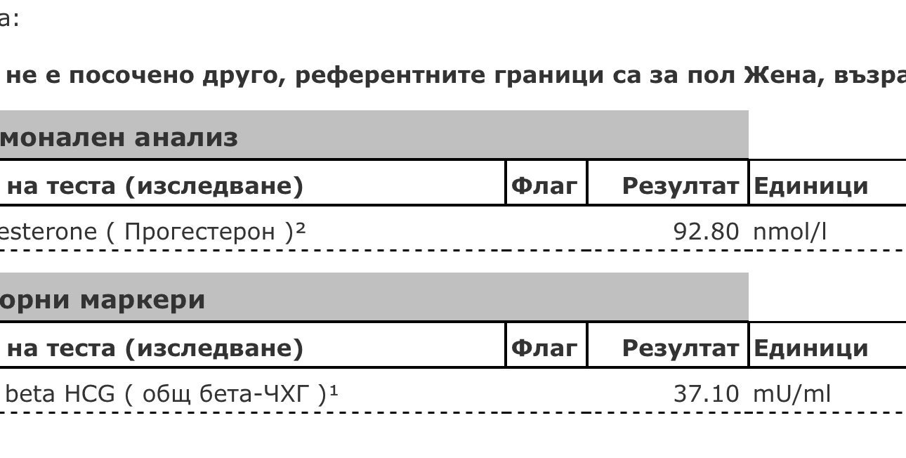 Резултатът излезе утре трябваше да ми дойде , реално все още нямам закъснение .. как са резултатите момичета , прогестеронът не е ли малко нисък ??? Другото което е резултатът не само че се е удвоил от ЧХГ , но почти се е утроил това добре ли е ?