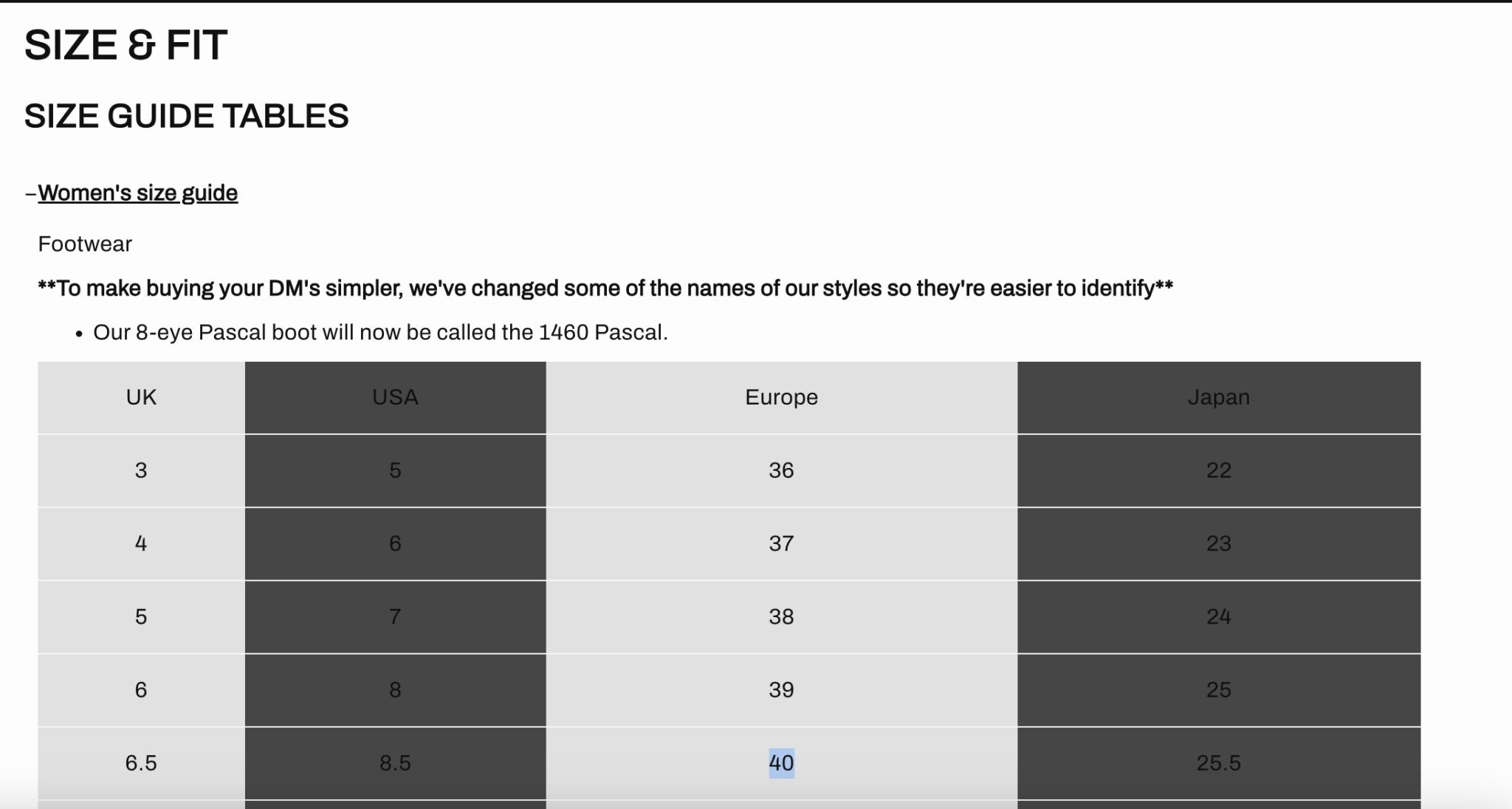 Аз имам един Dr Martens suede модел, 39, който определено ми е малък и един 40, който ми e точен, това е таблицата с размерите на сайта на Dr. Martens: