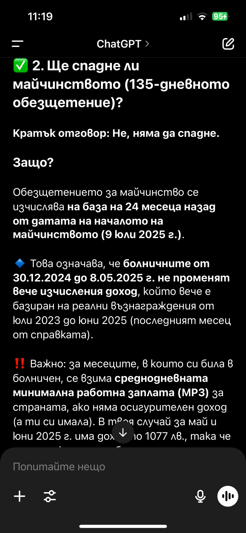 Азара., за съжаление ChatGPT не е добър за информация от правно, финансово и друго специализирано естество. Пробвала съм няколко пъти покрай мои ситуации. Например, на мен ми каза, че за да сменя фамилията на детето, трябва само и единствено да подам заявление в общината Joy Оказа се съдебно дело с декларации, няколко свидетели, и негарантиран резултат. Така че не бих го слушала за майчинството. Когато го попитах за майчинството и ми даде подобен отговор, му цитирах един-два закона и той каза "да, права си, благодаря, че ми каза да взема предвид и това. Действително това е така"...